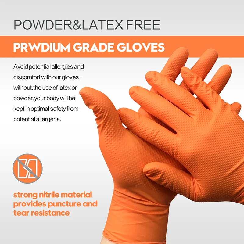 • Nitrile gloves feature raised diamond texture for exceptional grip. Nitrile delivers a comfort level rivaling that of latex. Strong, high-quality Nitrile material offers incredible stretch, no tearing or pinching.