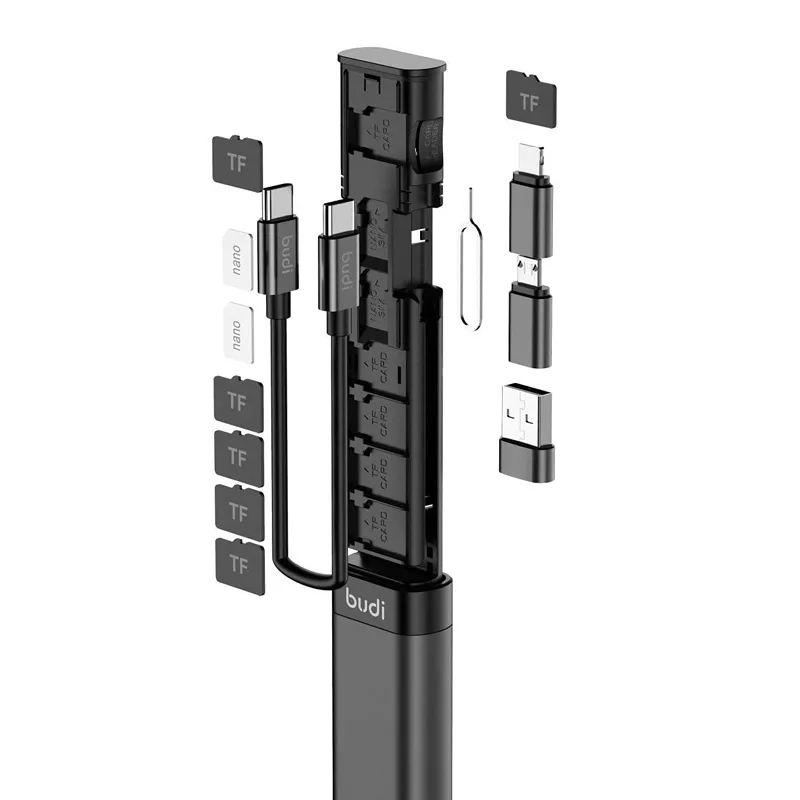 -3 часто используемых адаптера -Можно использовать как подставку для телефона -6 слотов для карт TF -Встроенный картридер памяти -2 слота Nano Sim Небольшой дизайн, идеально подходит для портативности Внутри мультитула 9 в 1: 1 x адаптер Type C-Micro USB 1 x адаптер типа C 1 x адаптер Type C-USB 1 x Кабель Type C-Type C 1 х эжектор для Sim-карты Посылка 1 x Многофункциональный зарядный кабель Budi 9 в 1