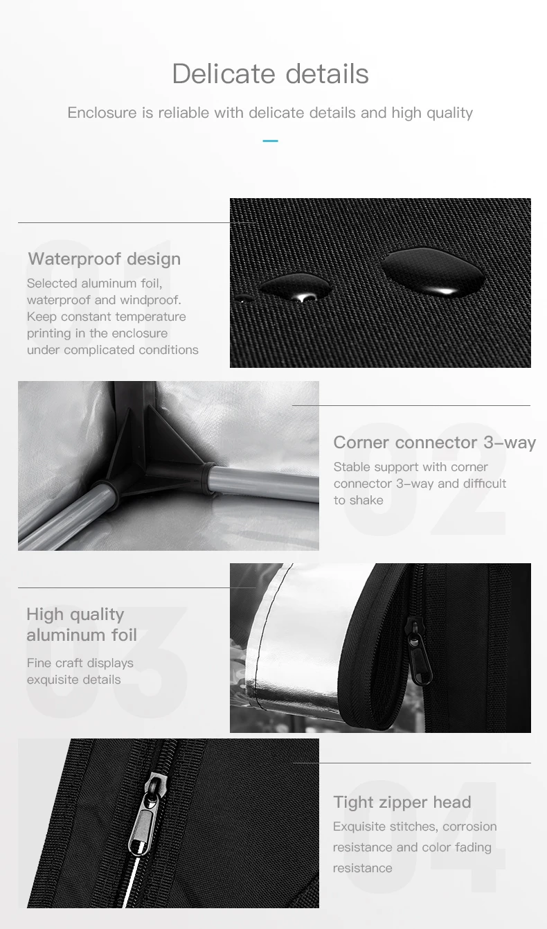 3D Printer Enclosure features great dustproof and noise reduction effect.It can block the noise from the printer process.It is also dustproof,you can only cleaned by wiping lightly with a rag.