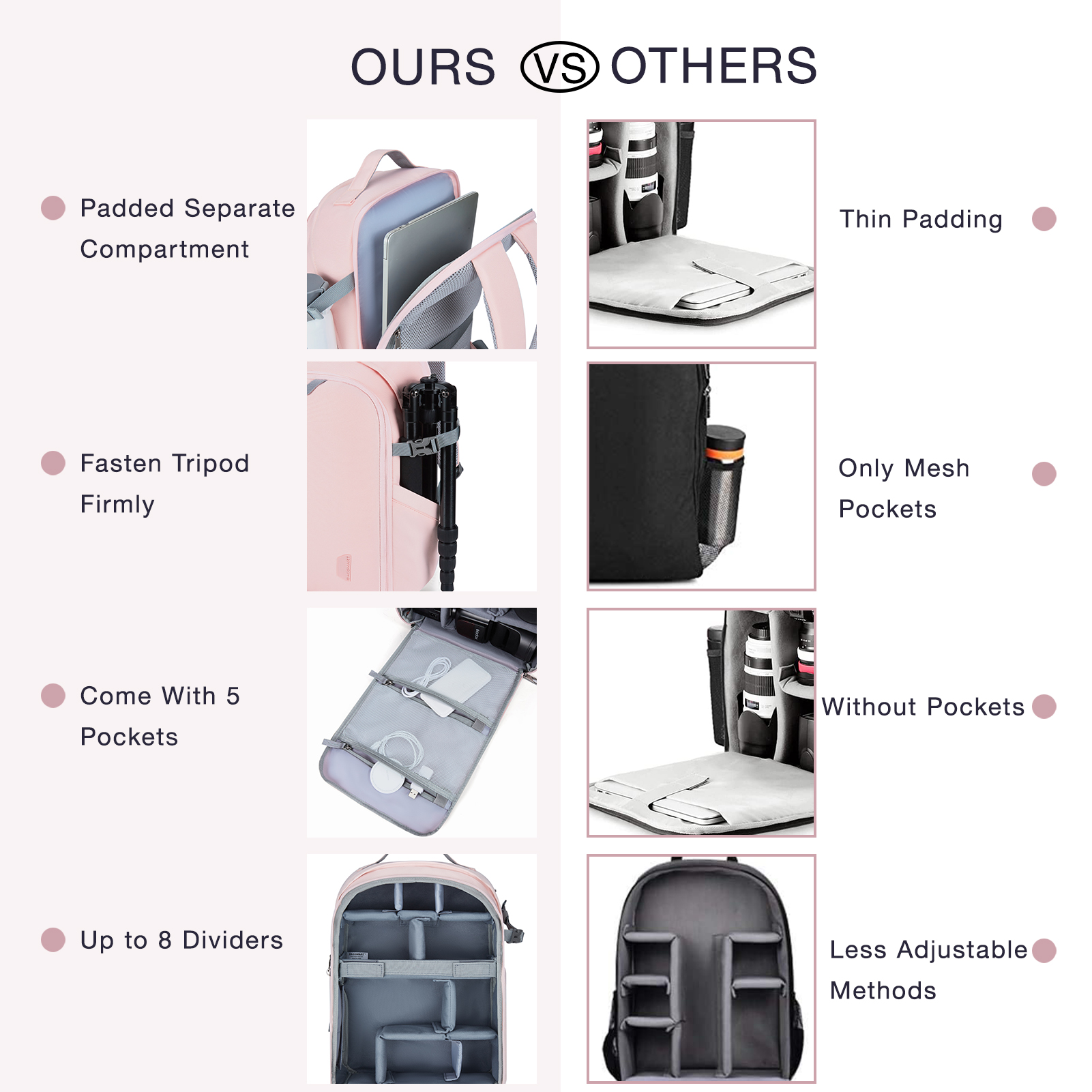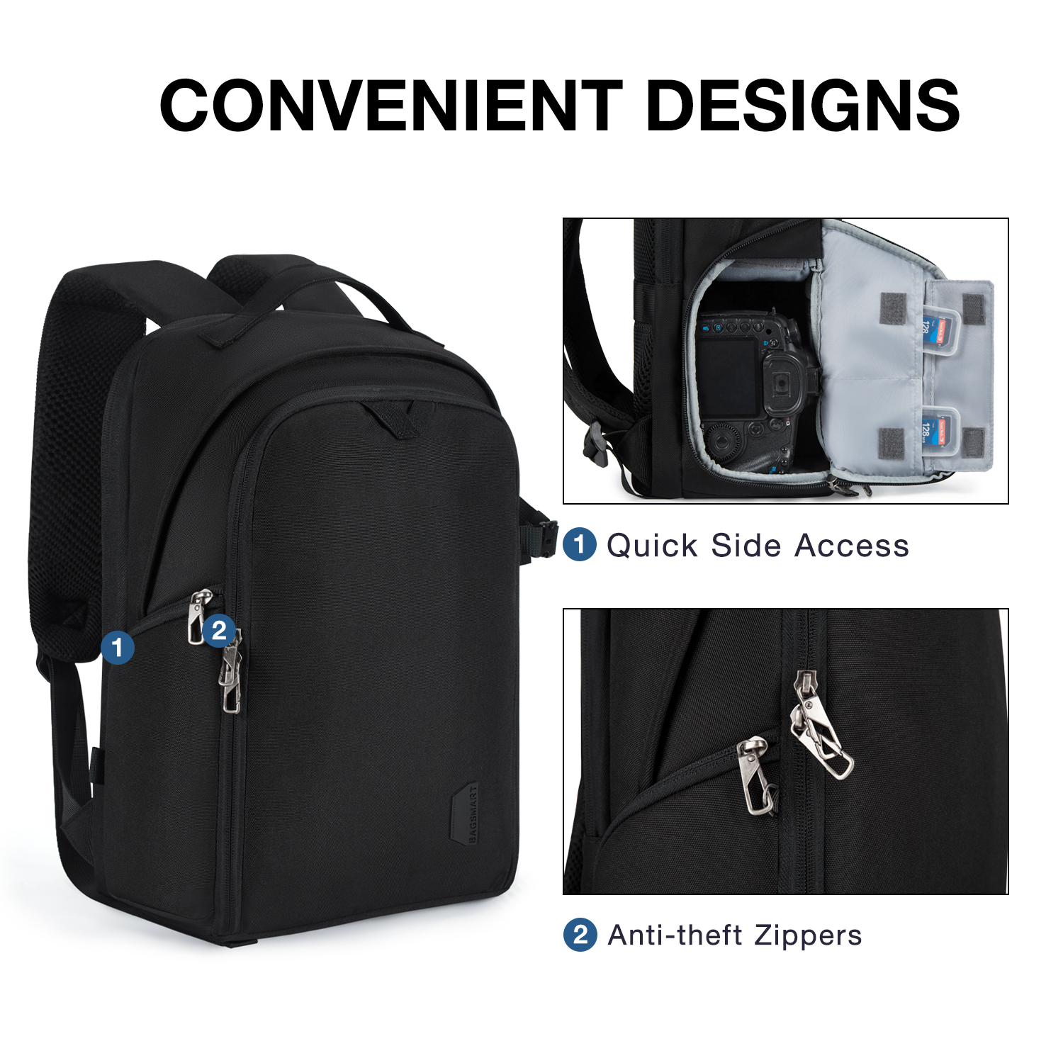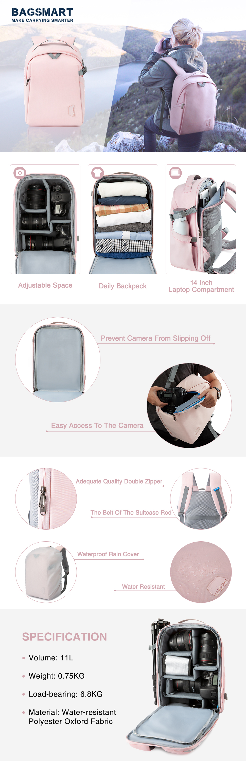Рюкзак для камеры многофункциональный для хранения ваших камер, планшета, бутылки с водой и других мелких вещей. Водонепроницаемый материал и большая емкость, сумка подходит для улицы или путешествий. Также его можно закрепить на штанге чемодана за задний ремень.
