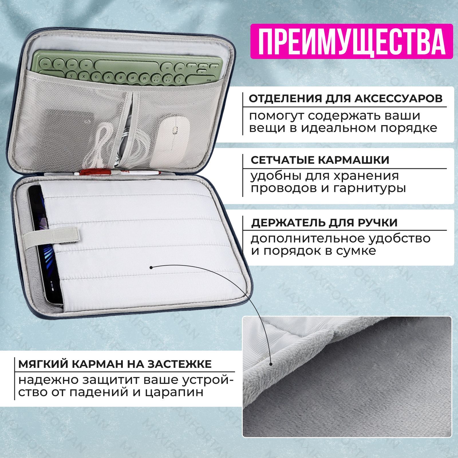 Текст при отключенной в браузере загрузке изображенийКачество в каждой детали:Мягкий карман на застежке - надежно защитит Ваше устройство от падений и царапин.Текст при отключенной в браузере загрузке изображенийПреимущества:Идеален в качестве подарка!