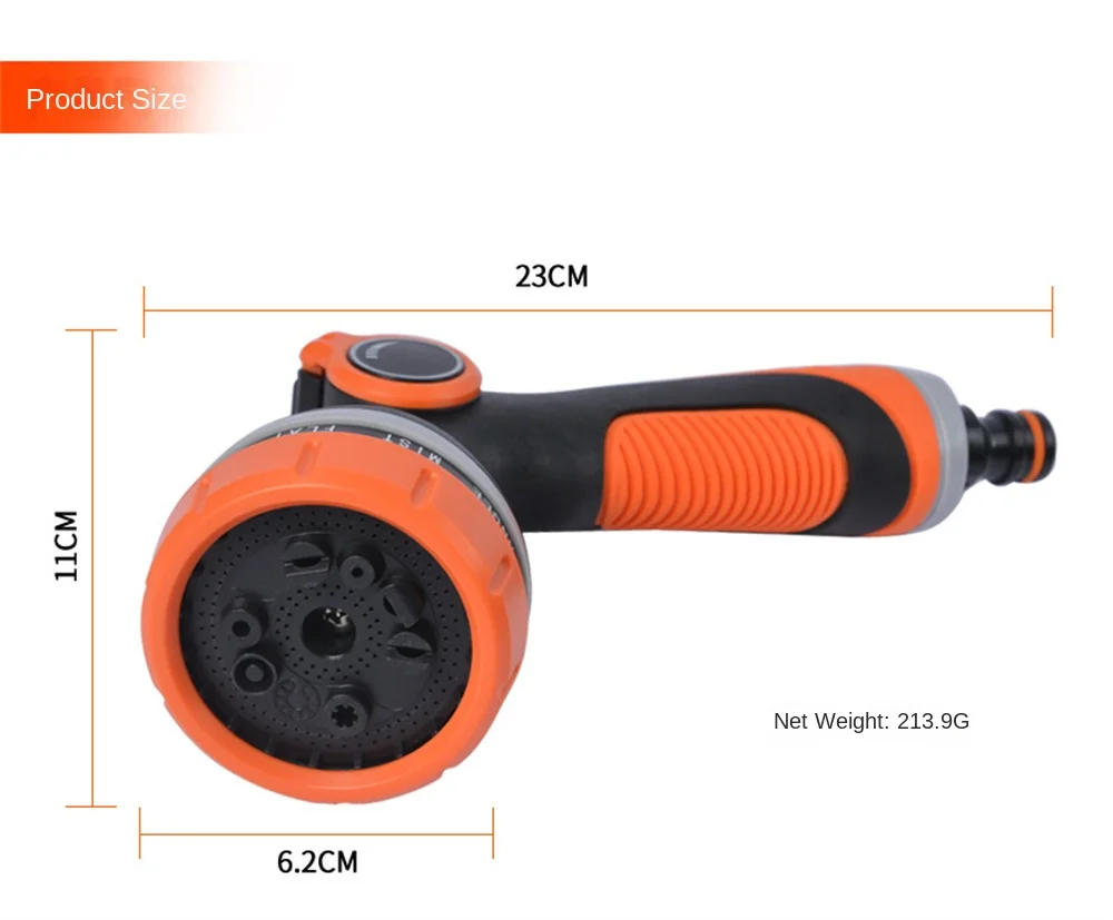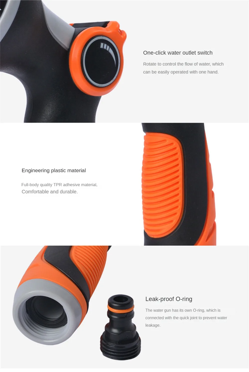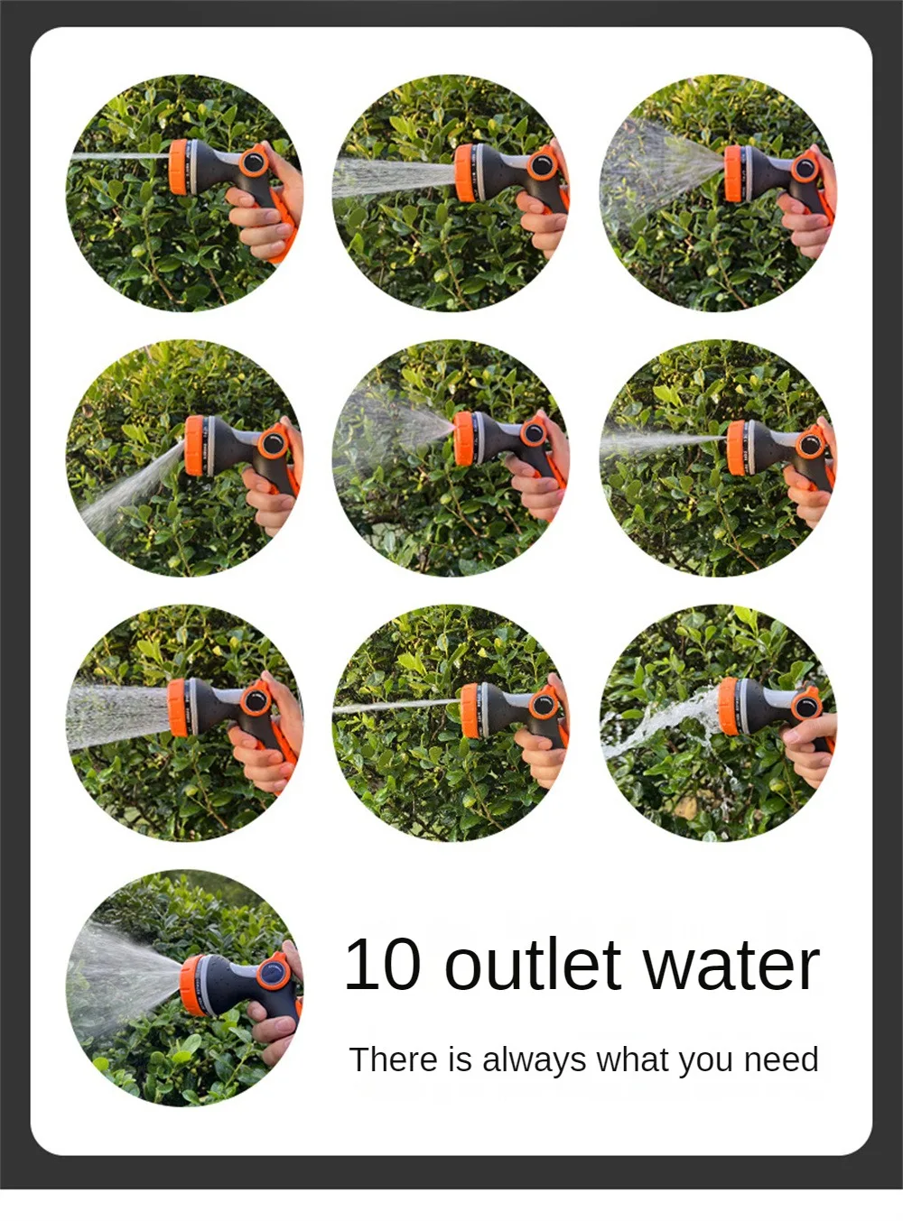 2.10 видов функций, более подходящих для полива цветов, может быстро Переключить режим выхода воды, тонкий туман/прямой туман, вращение может регулировать десять различных режимов распыления, И удовлетворить потребности полива цветов и мытья автомобиля в то же время