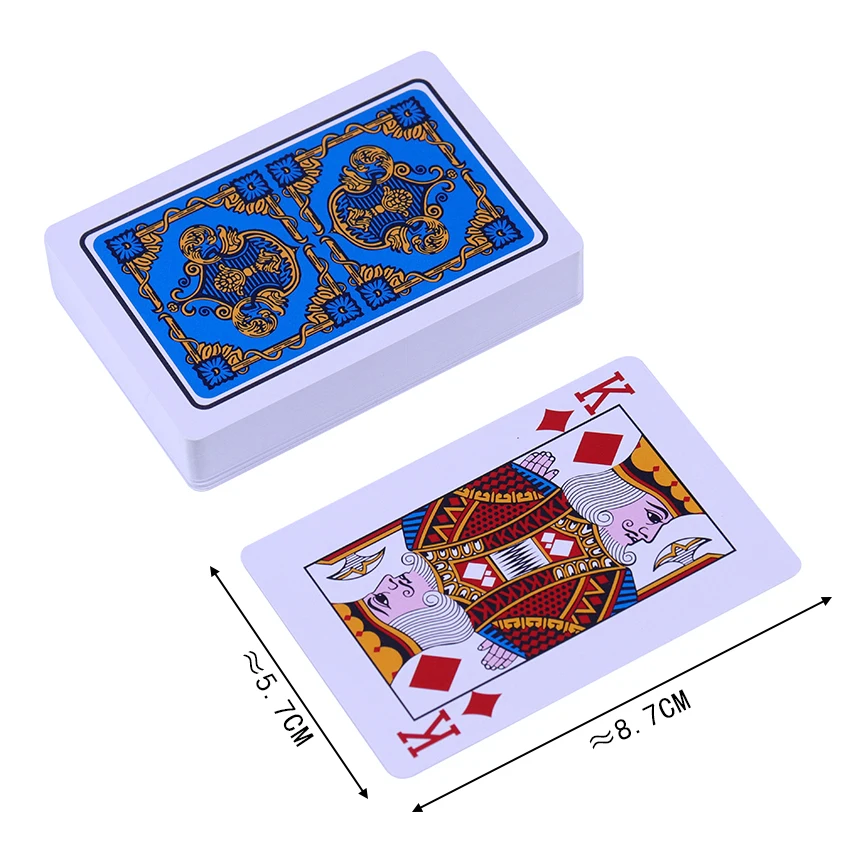 Тип: нормальный Уровень сложности игры: первичный Максимальное количество игроков: неограниченное количество Продолжительность игры: 0-30 минут Цвет: черный, красный, синий. Материал: ПВХ Количество: 54 листа Размеры: около 5,7*8,7 см Посылка: игральные карты-1 шт.