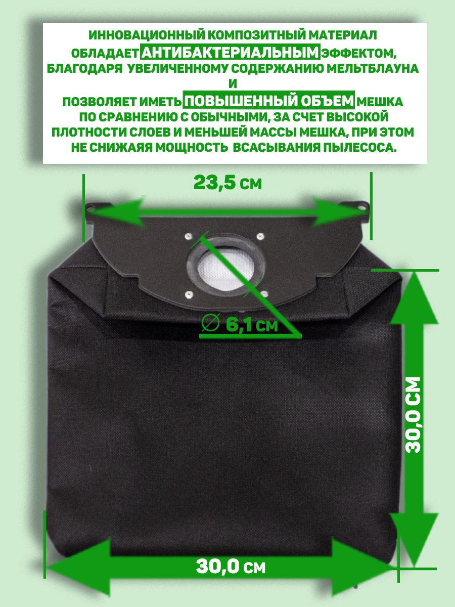 Многоразовый мешок-пылесборник для пылесоса KARCHER применяется для сбора строительного мусора и пыли. Мешок изготовлен из многослойного нетканого материала «Claspro», благодаря чему выдерживает 25 циклов использования. Материал водостойкий, можно собирать влажный мусор и воду. Обладает высокой степенью фильтрации, класс пыли «L» - задерживает 99% частиц.