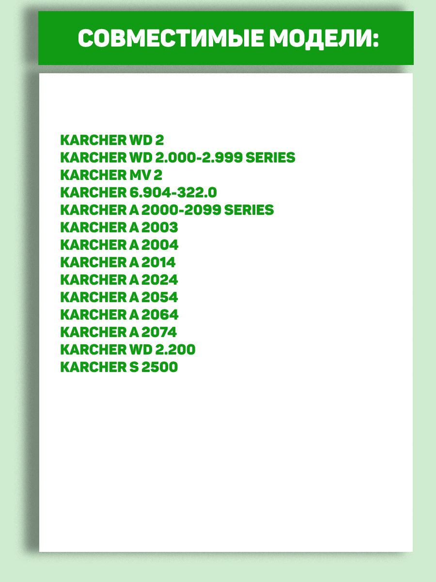 KARCHER MV 2, KARCHER WD 2, KARCHER WD 2.200, KARCHER 6.904-322.0, KARCHER A 2000-2099 series, KARCHER A 2003, KARCHER A 2004, KARCHER A 2014, KARCHER A 2024, KARCHER A 2054, KARCHER A 2064, KARCHER A 2074, KARCHER S 2500, KARCHER WD 2.000-2.999 series