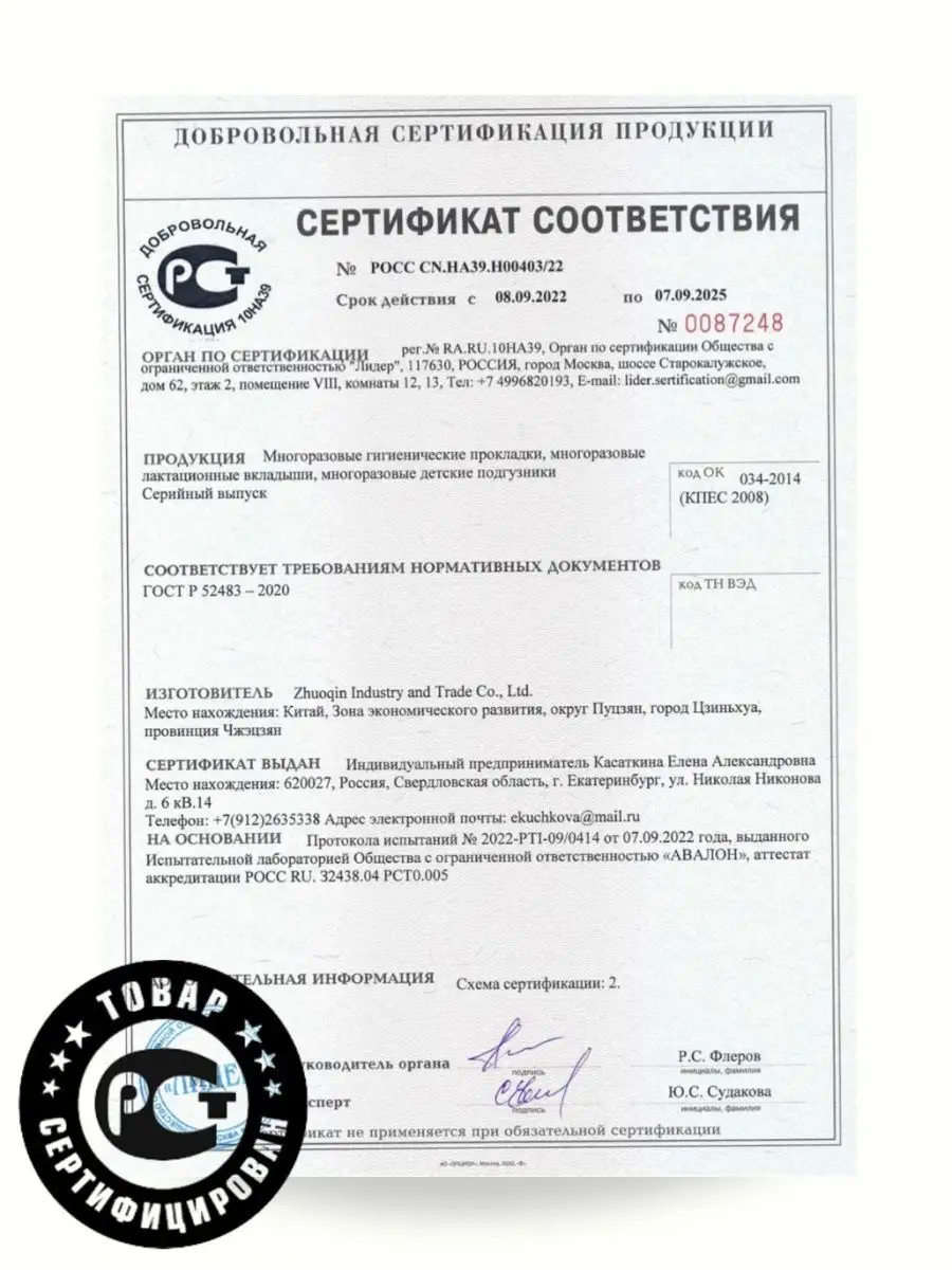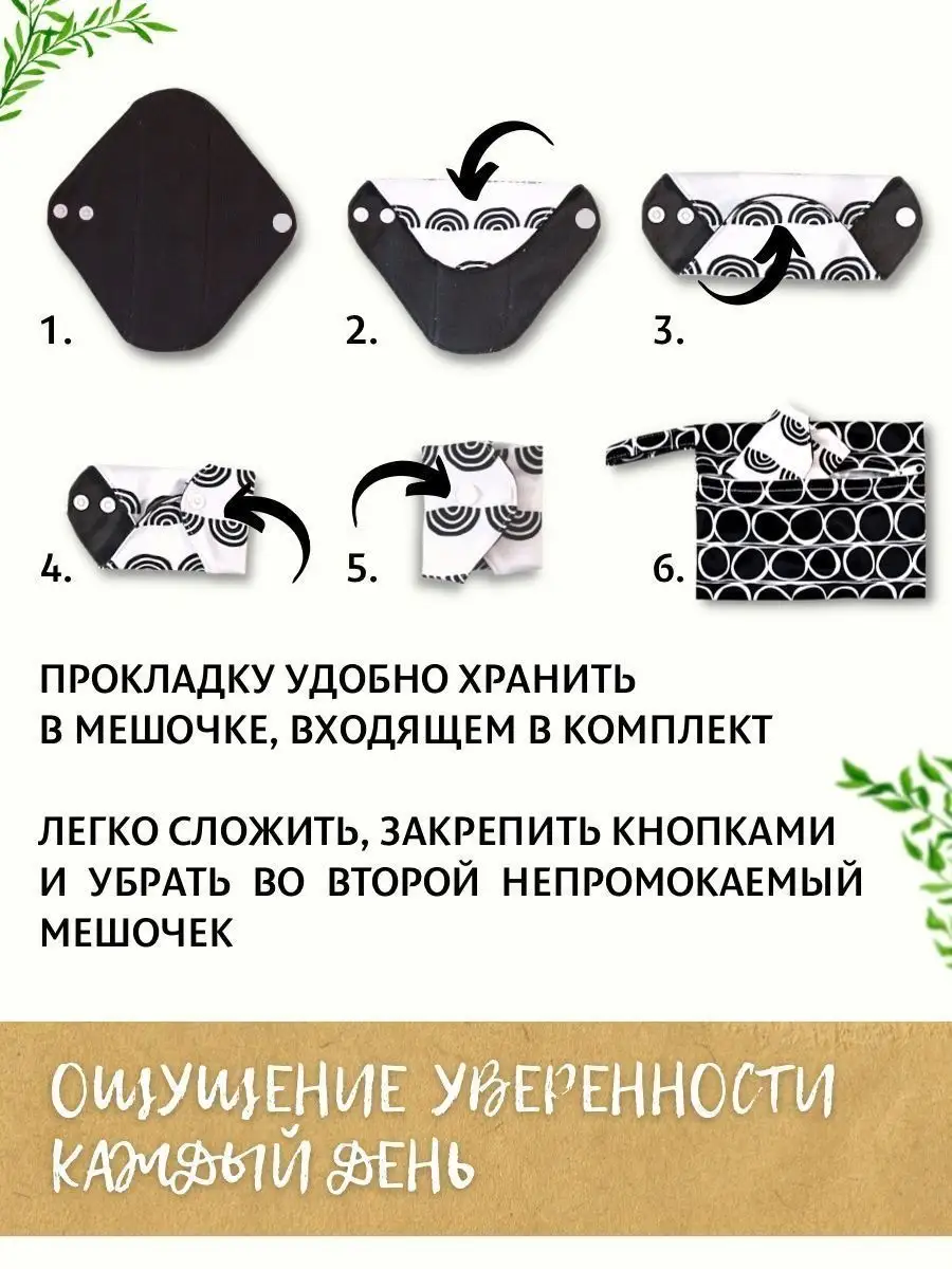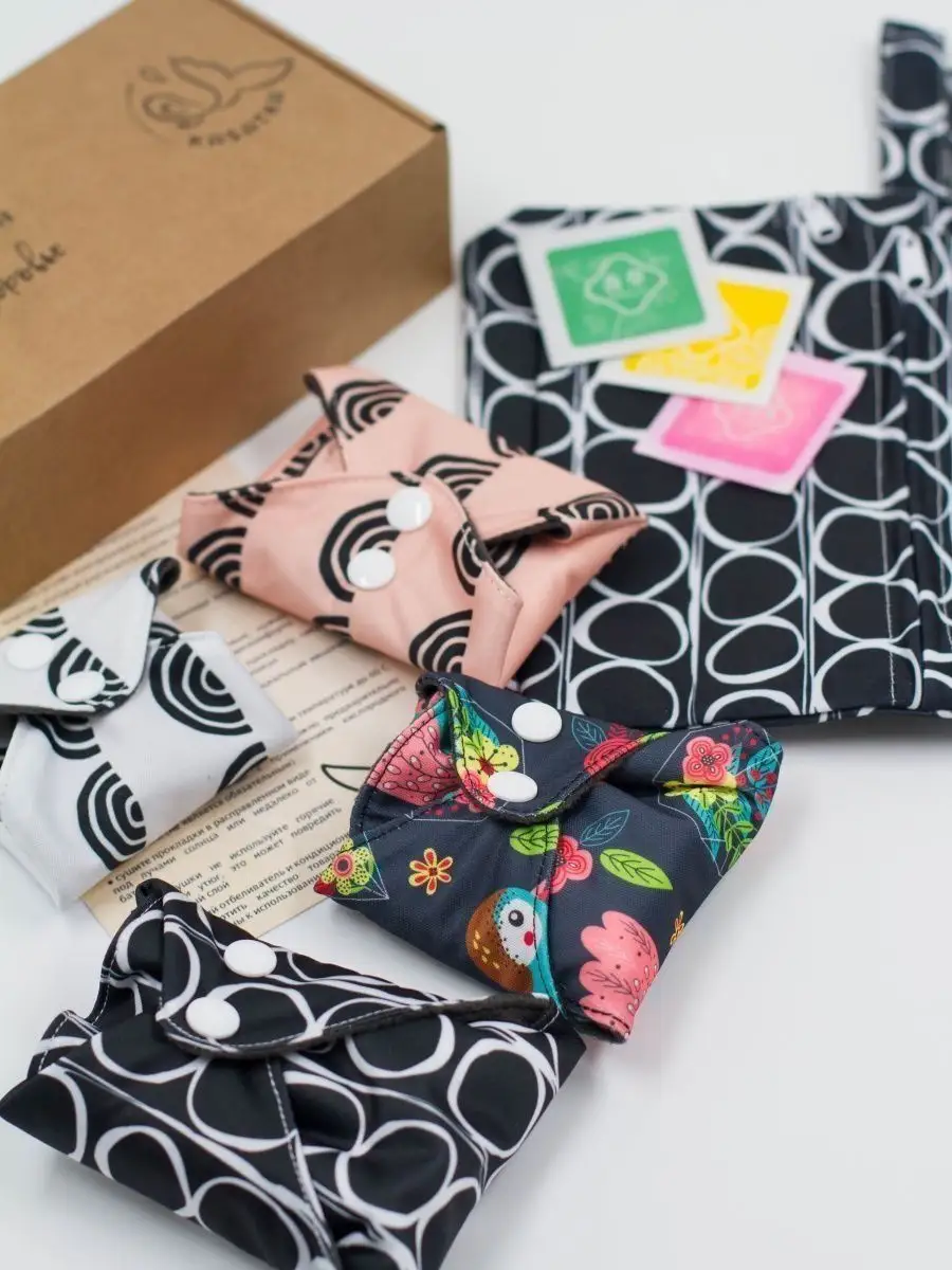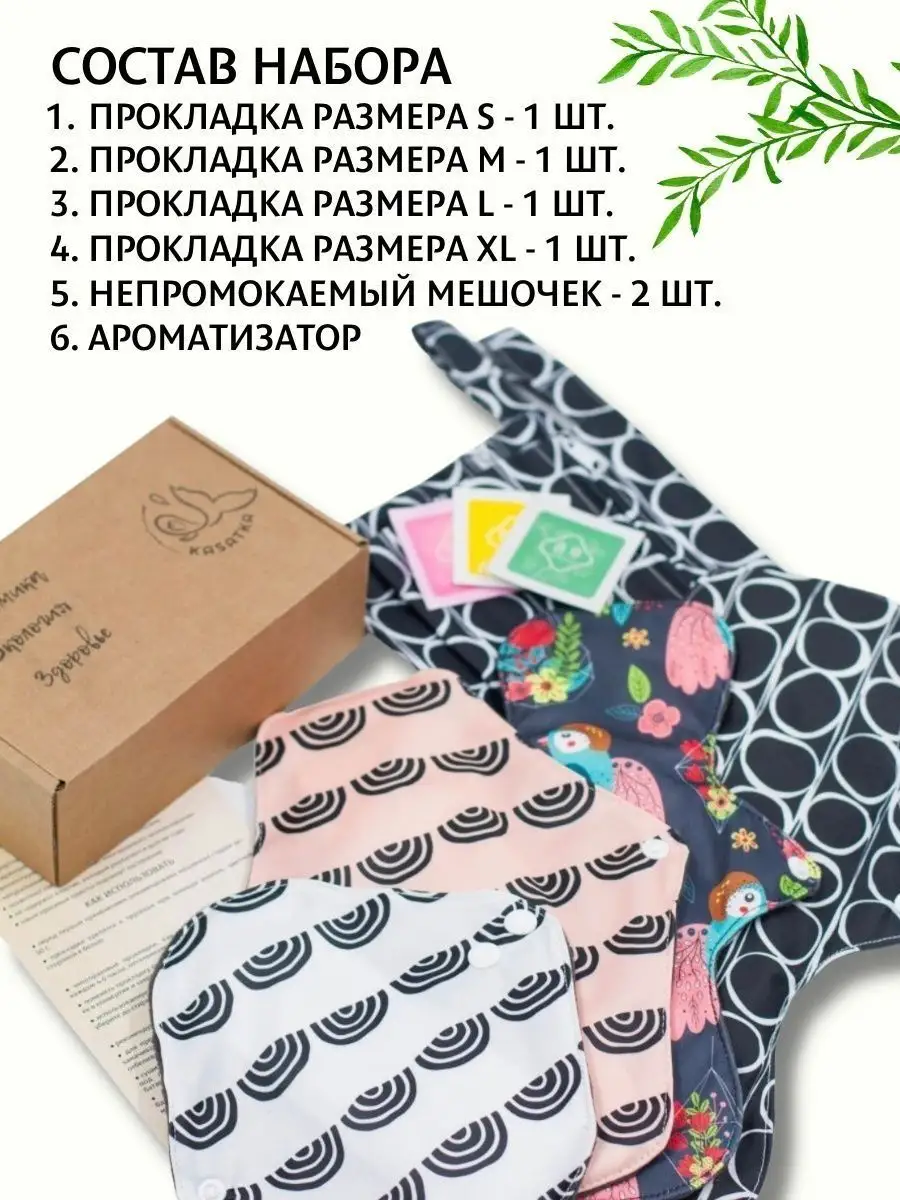 Комплектация коробка; ароматизатор; Многоразовые женские прокладки 4 шт; Непромокаемый мешок - 2 шт