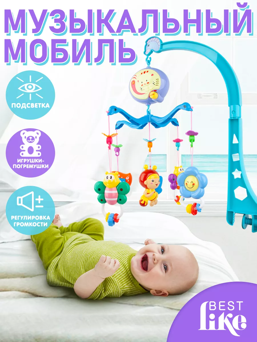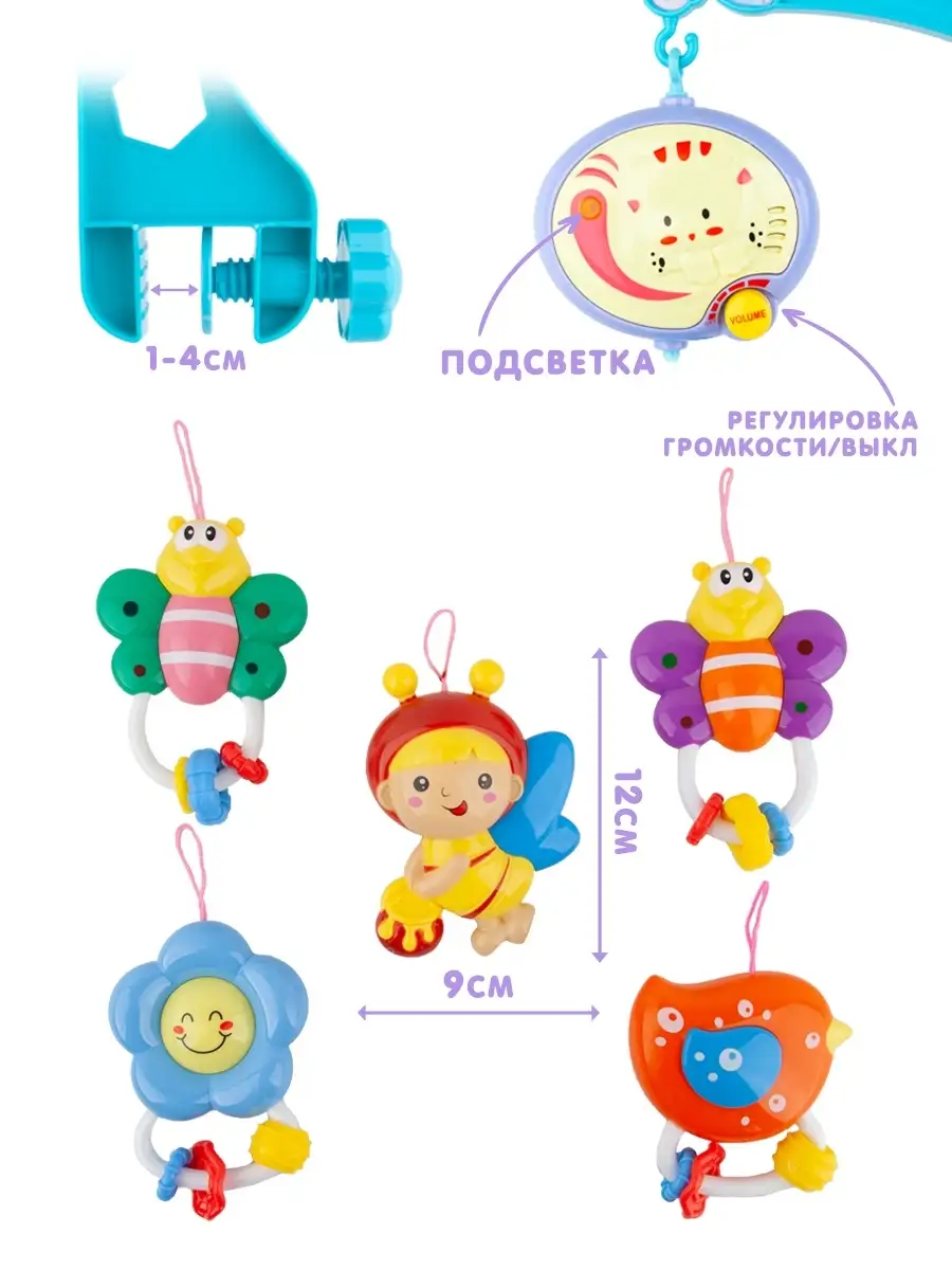 Особенности мобиля винтовое крепление; вращение игрушек; регулировка громкости