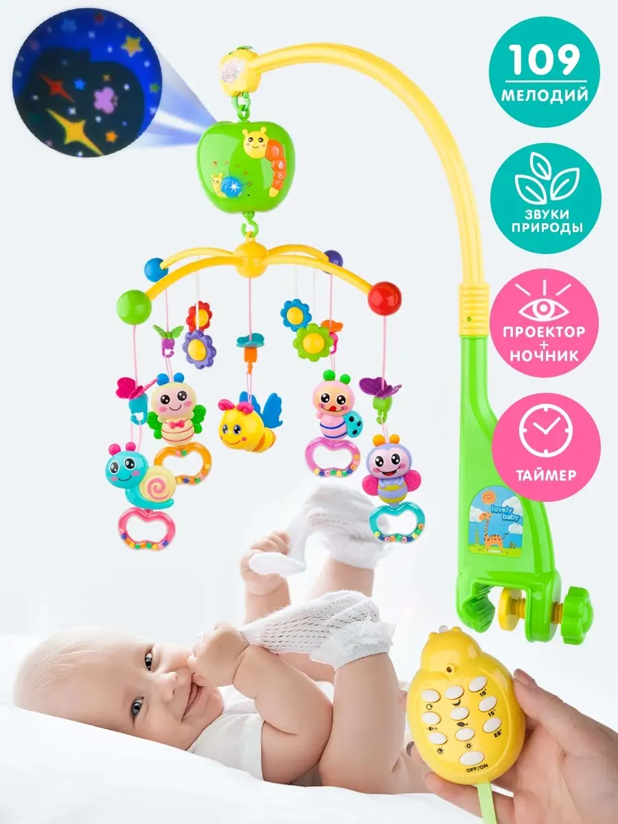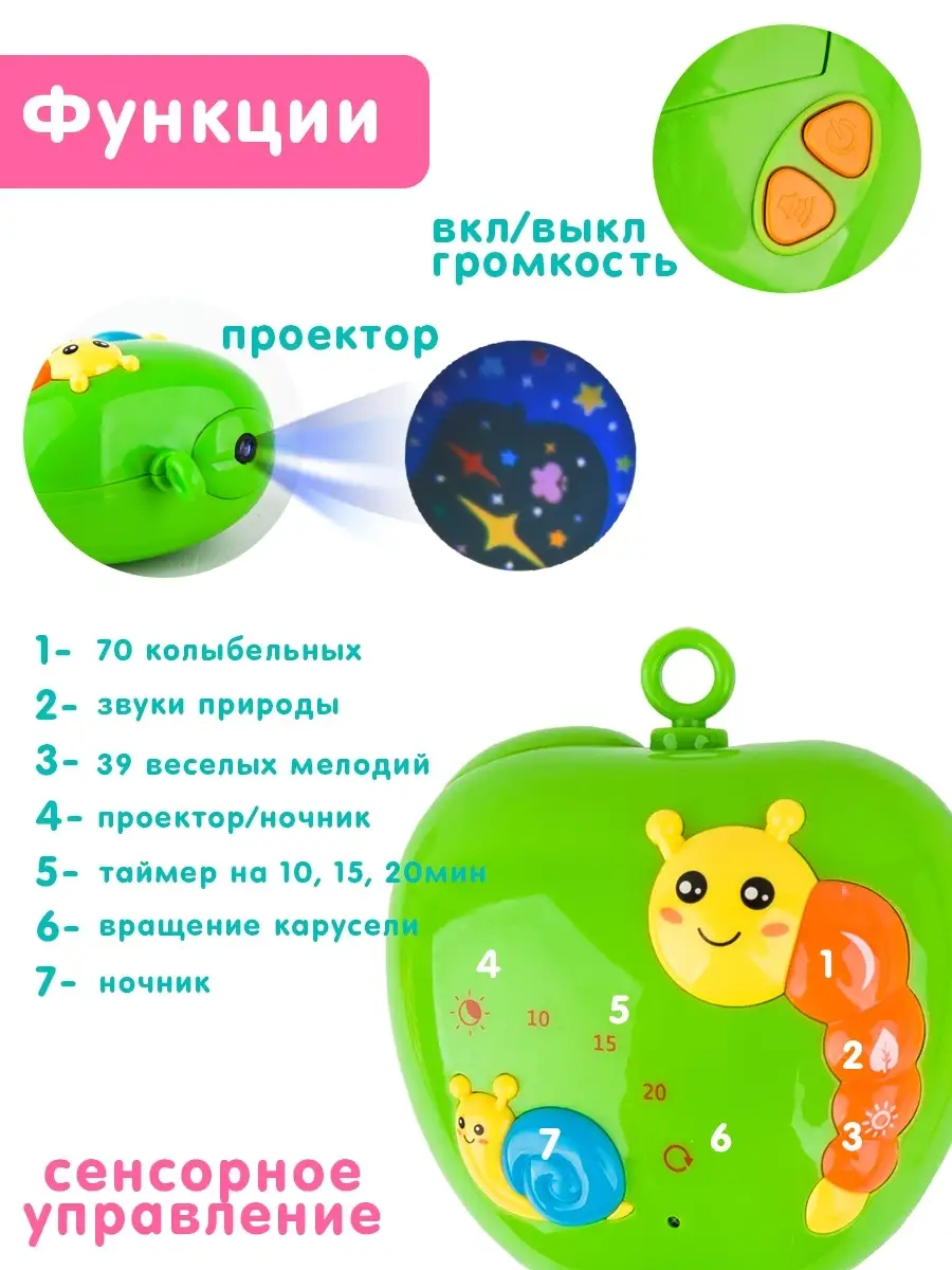 Особенности мобиля проектор; вращение игрушек; громкость регулируется