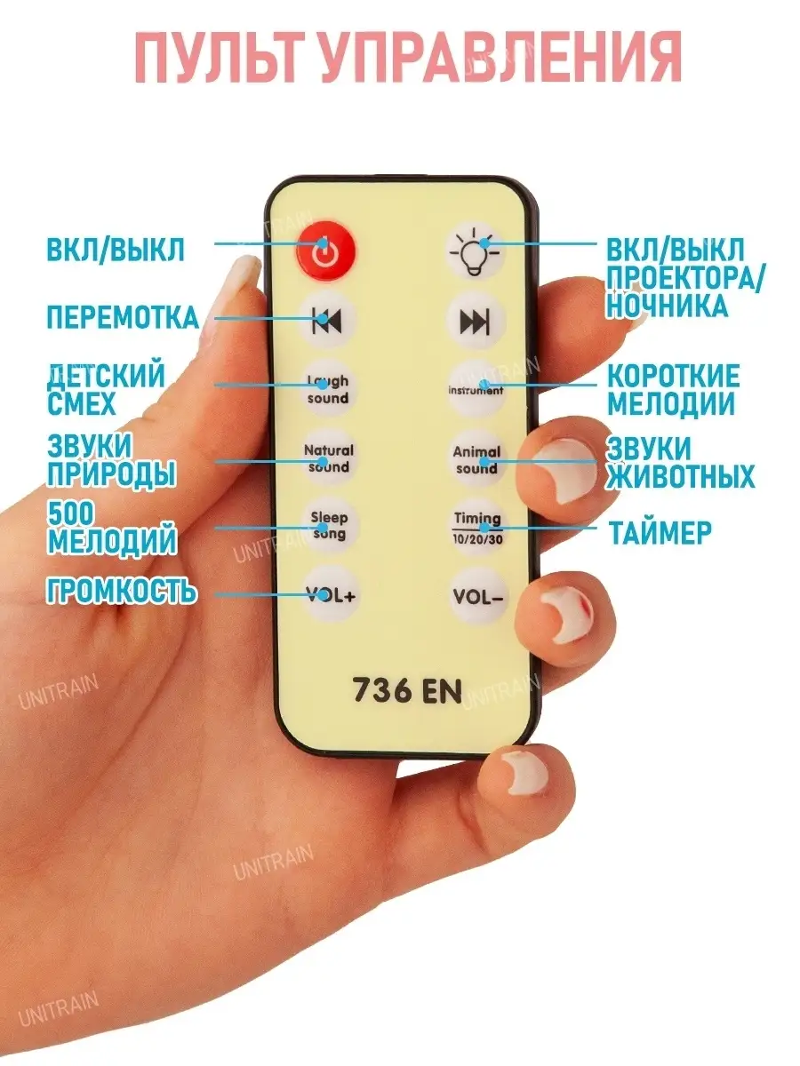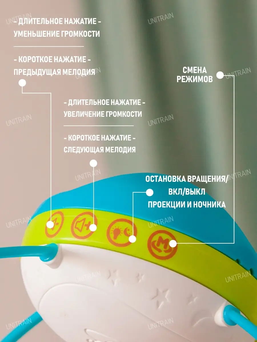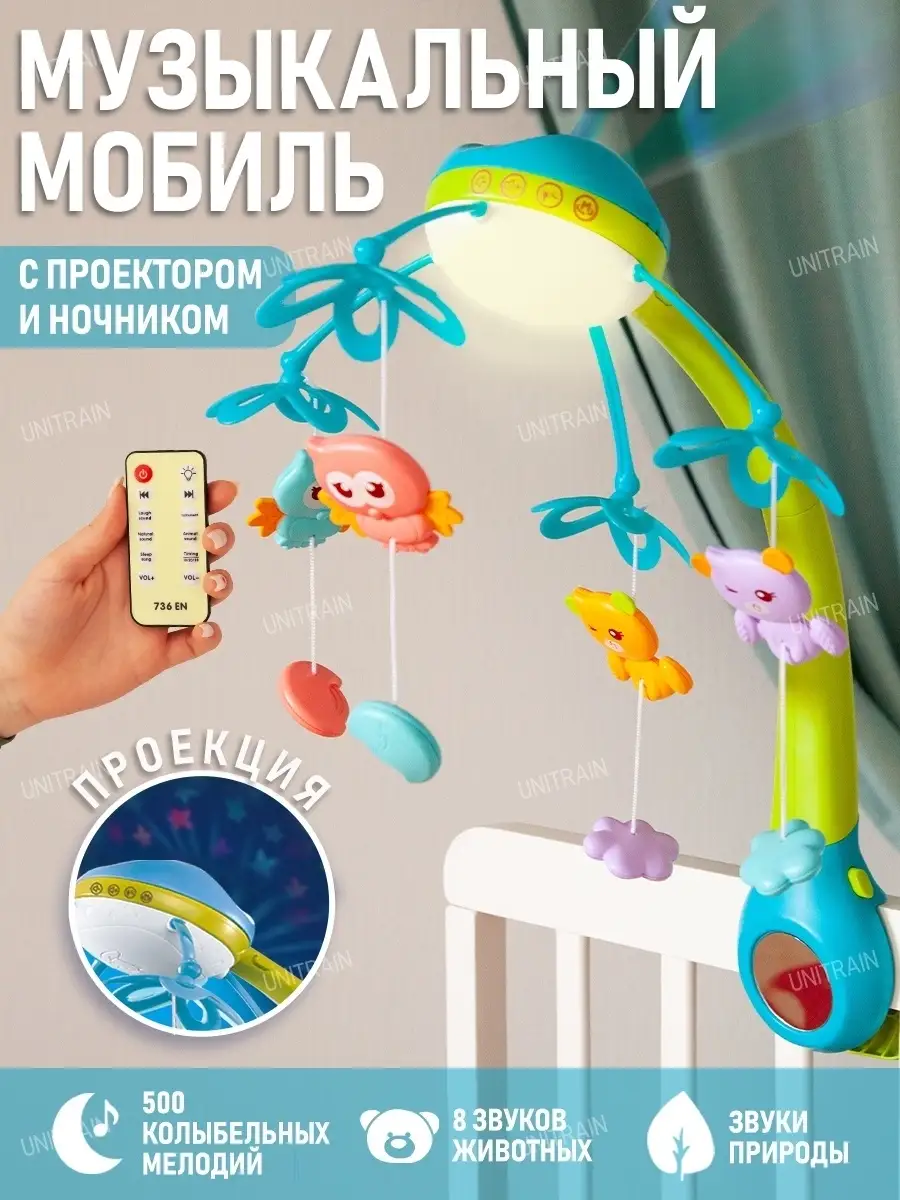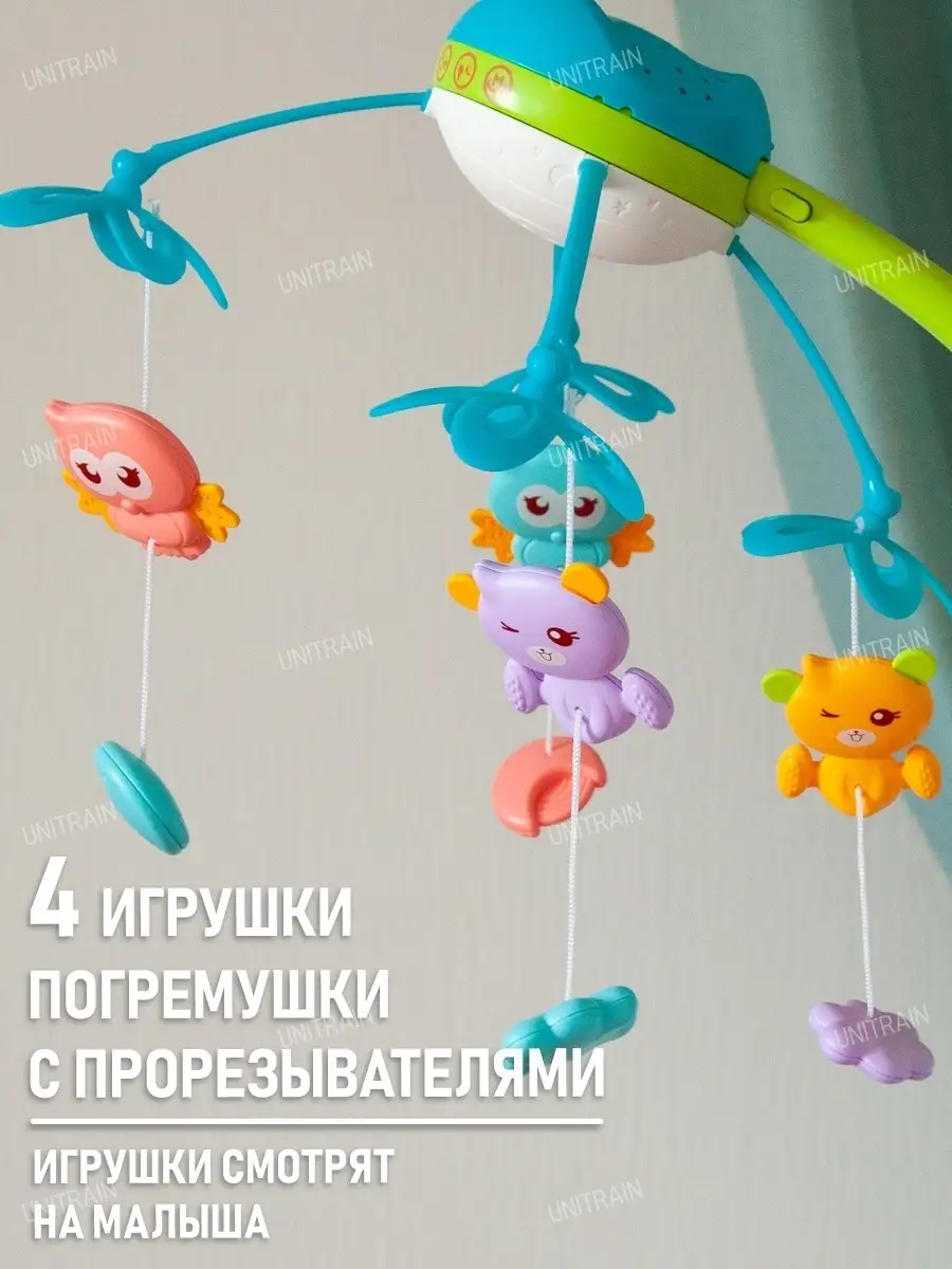 Особенности мобиля вращение игрушек; съемные игрушки; проектор
