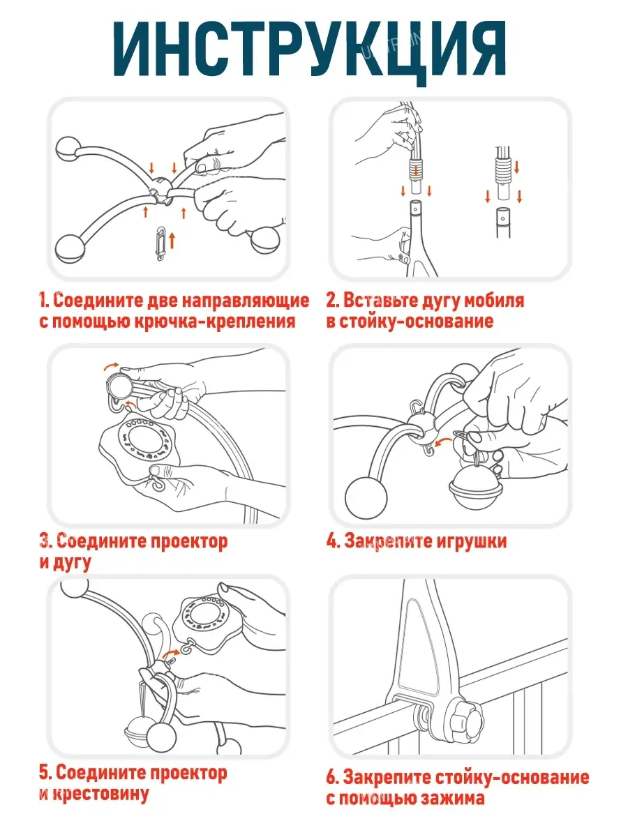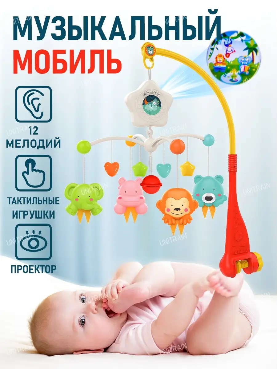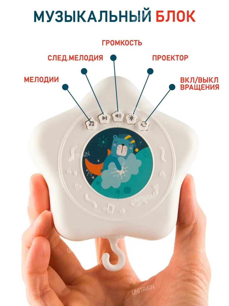 Особенности мобиля вращение игрушек; съемные игрушки; ночник проектор