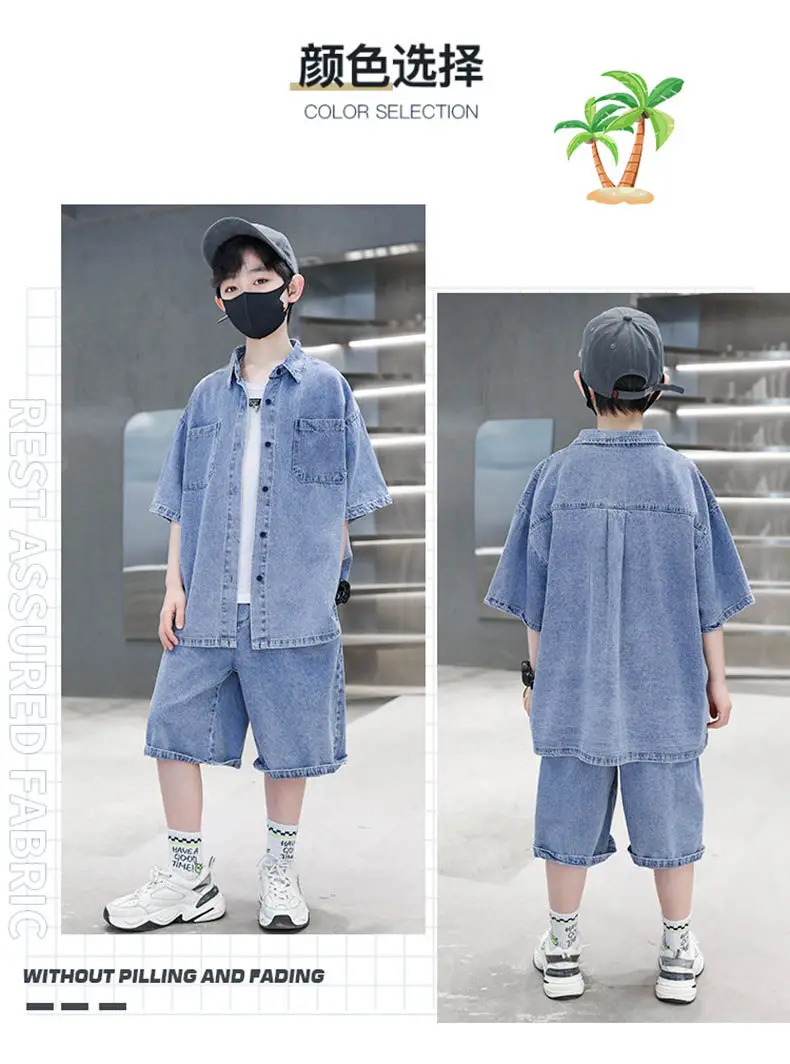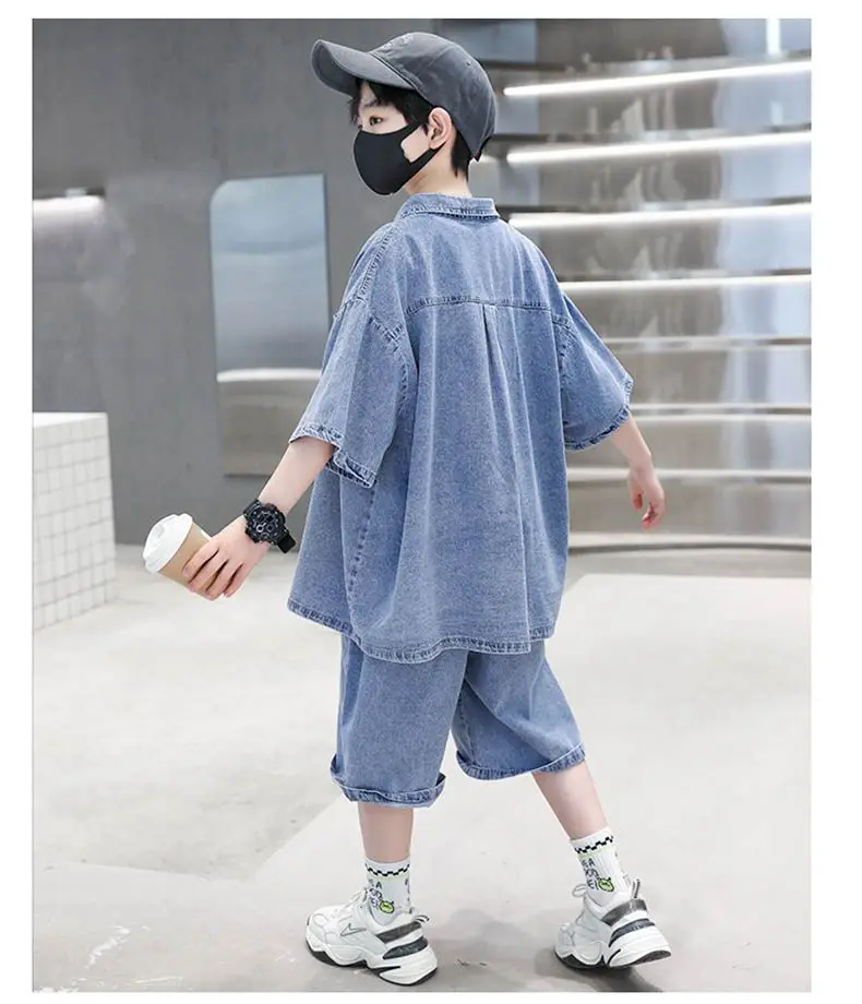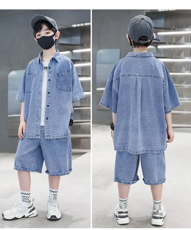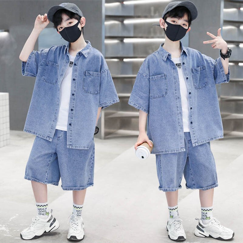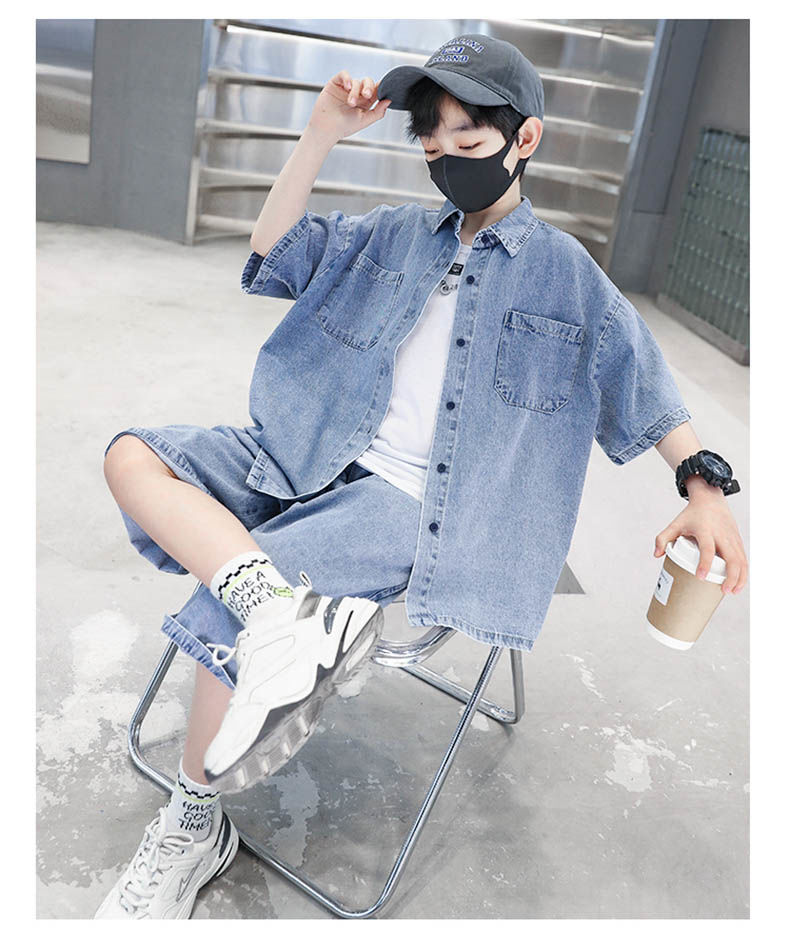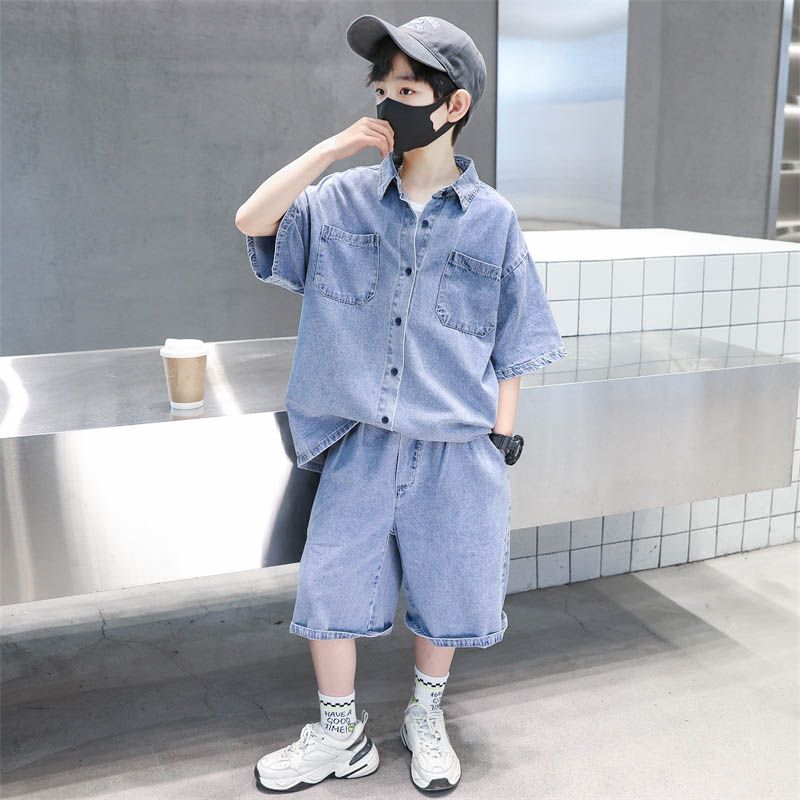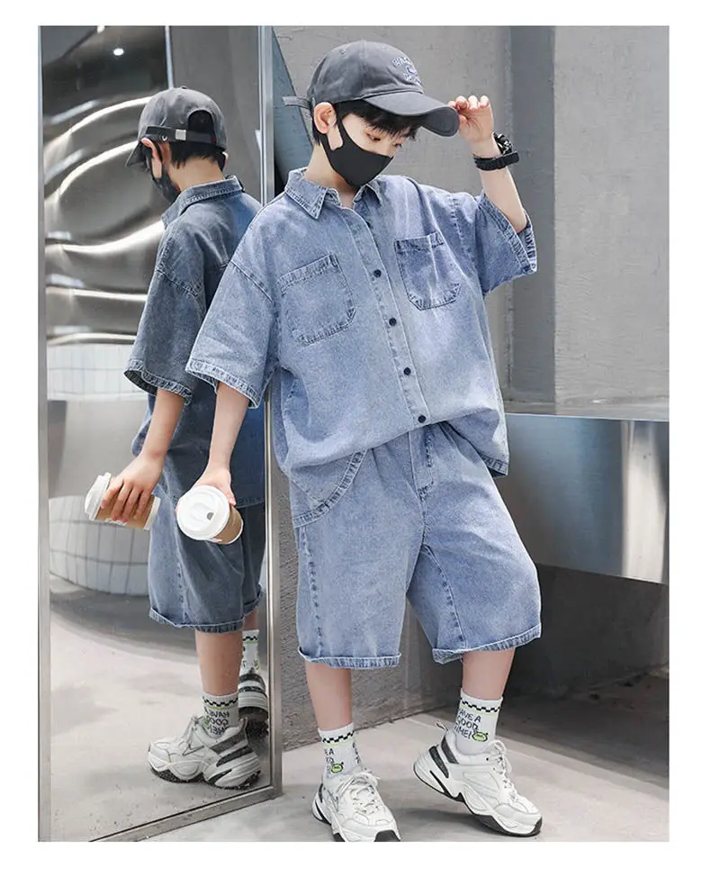 2023 Летний костюм для мальчиков Подростковые джинсовые рубашки с короткими рукавами + брюки Детская хлопковая спортивная одежда из 2 предметов Комплект одежды для мальчиков