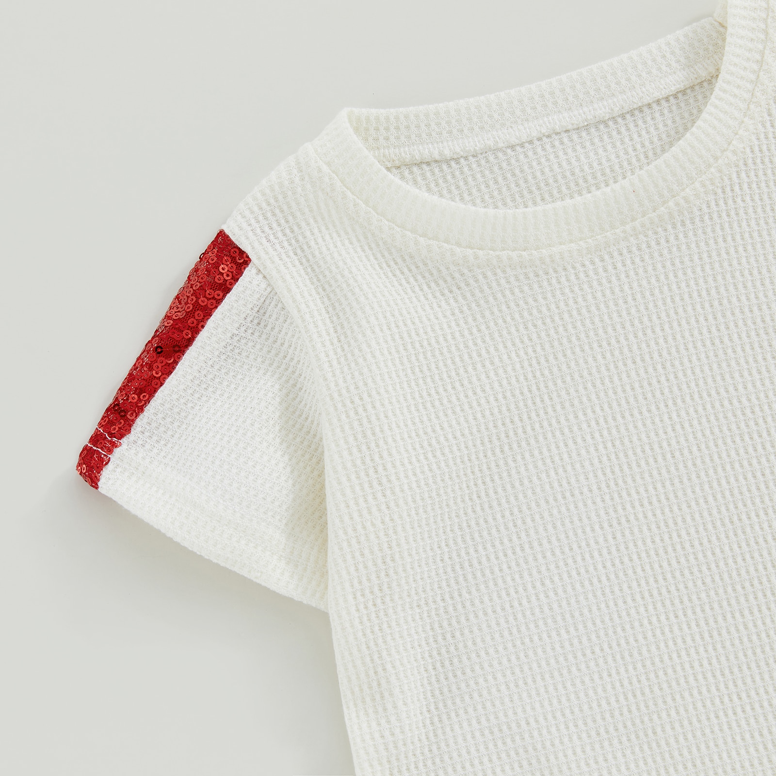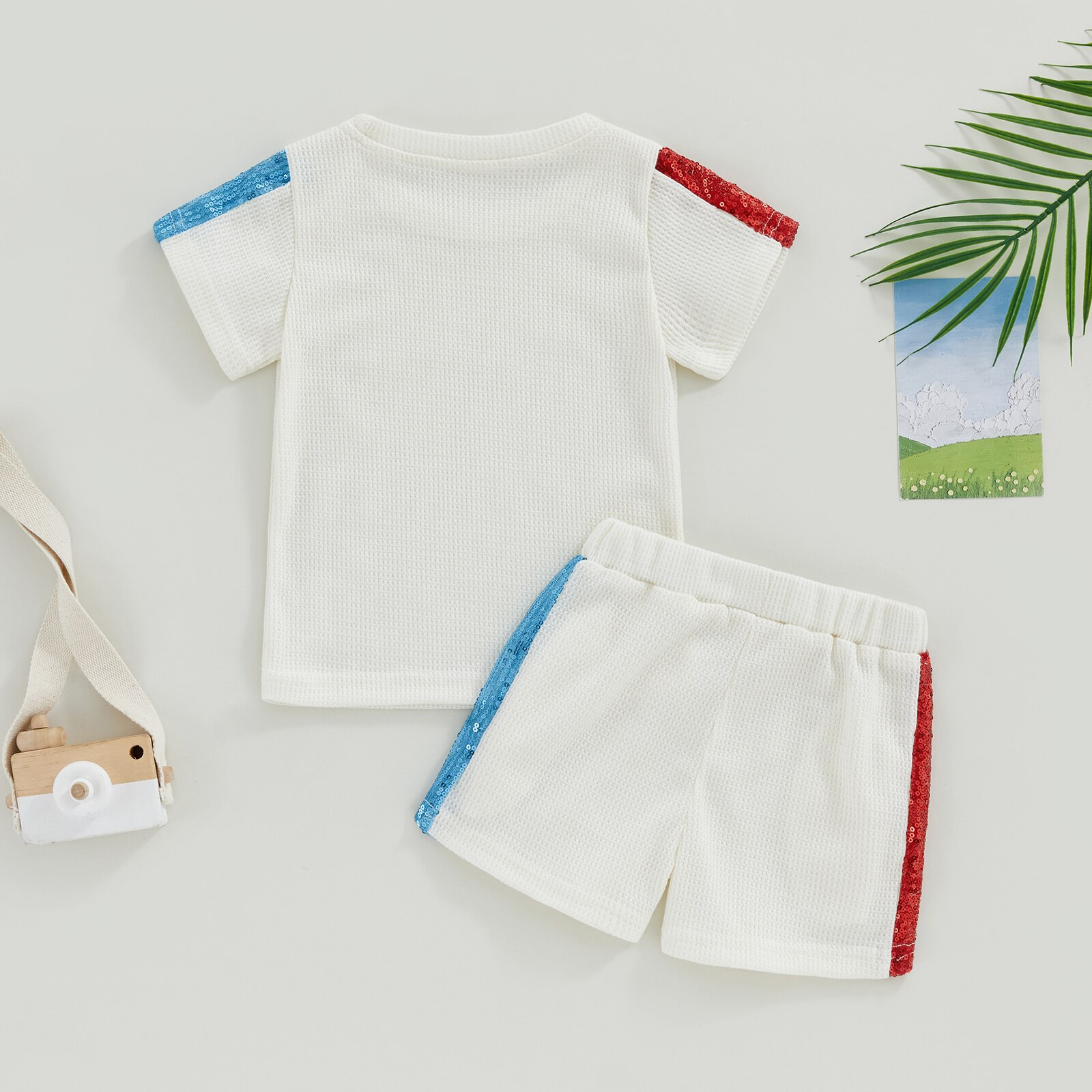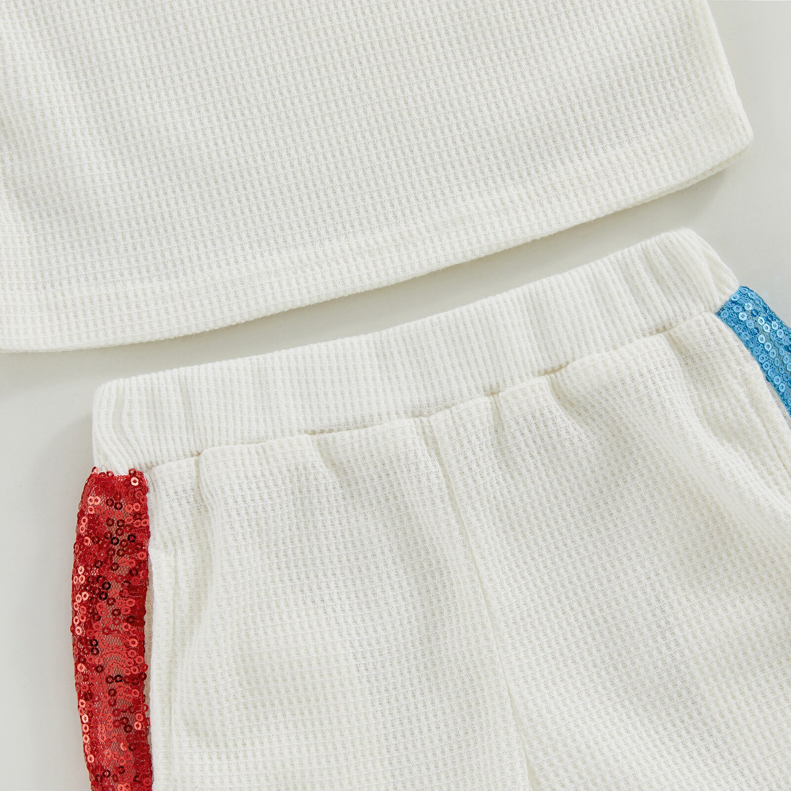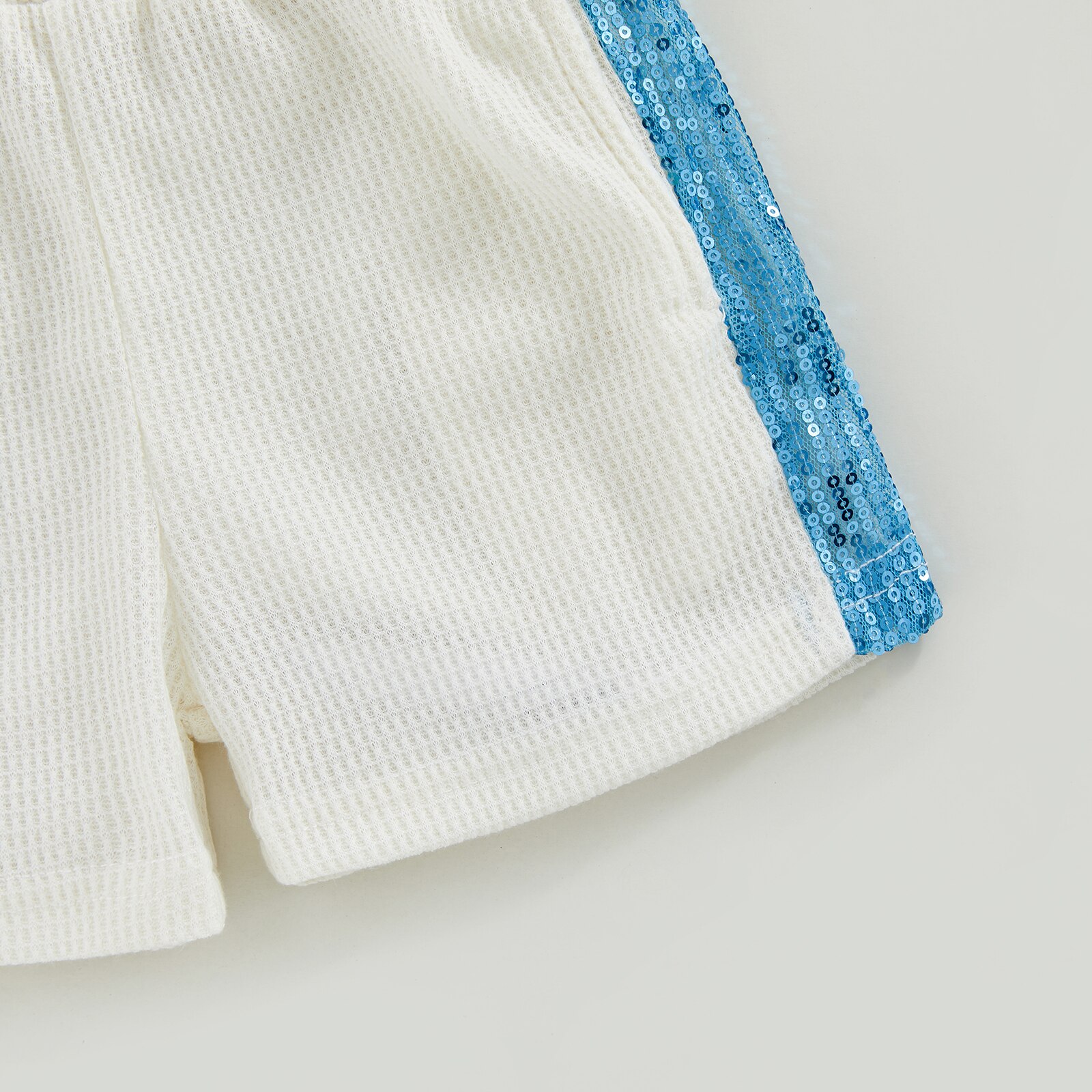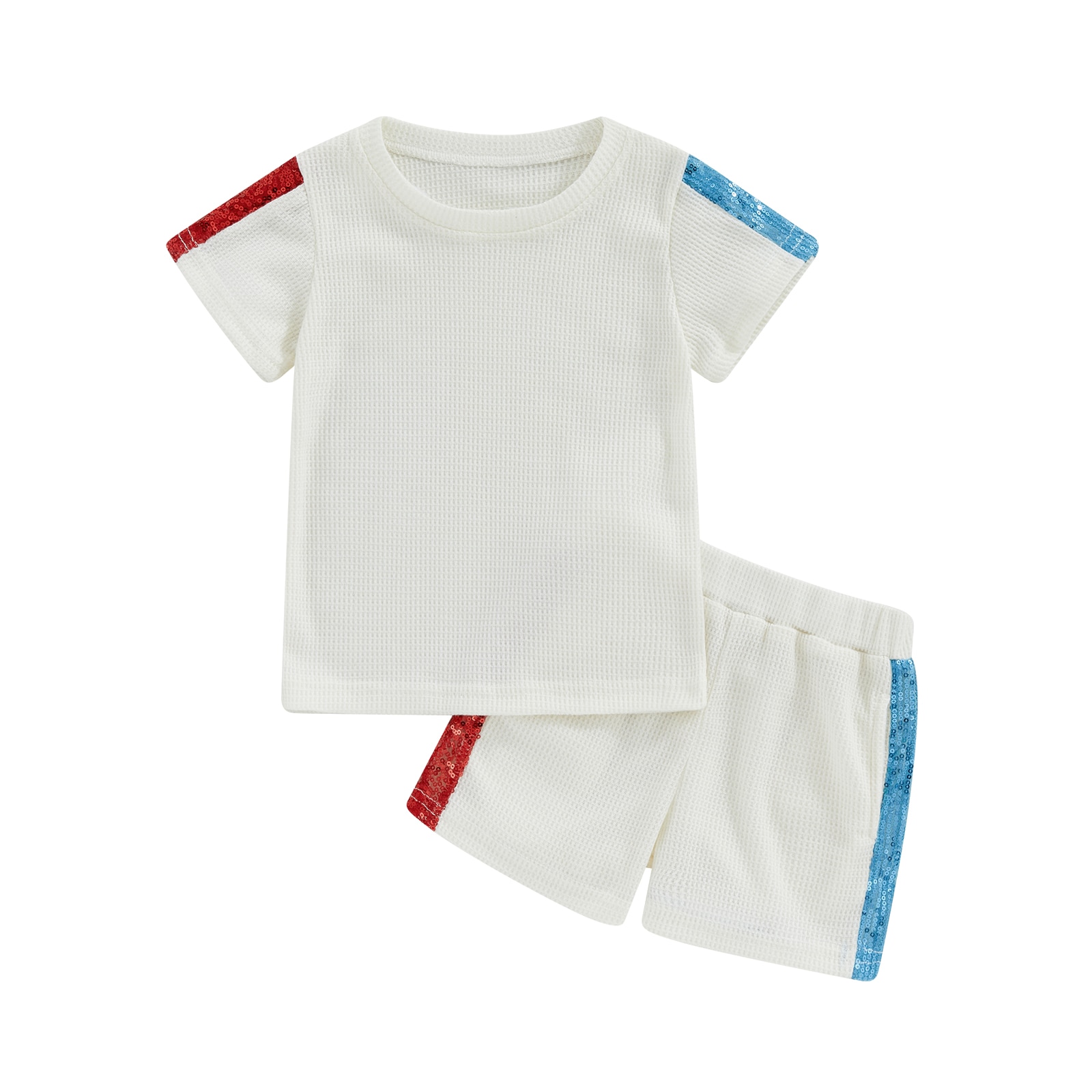 Модель 2023, летняя одежда для девочек, повседневный блестящий костюм из футболки с коротким рукавом и вафельных шортов в стиле пэчворк
