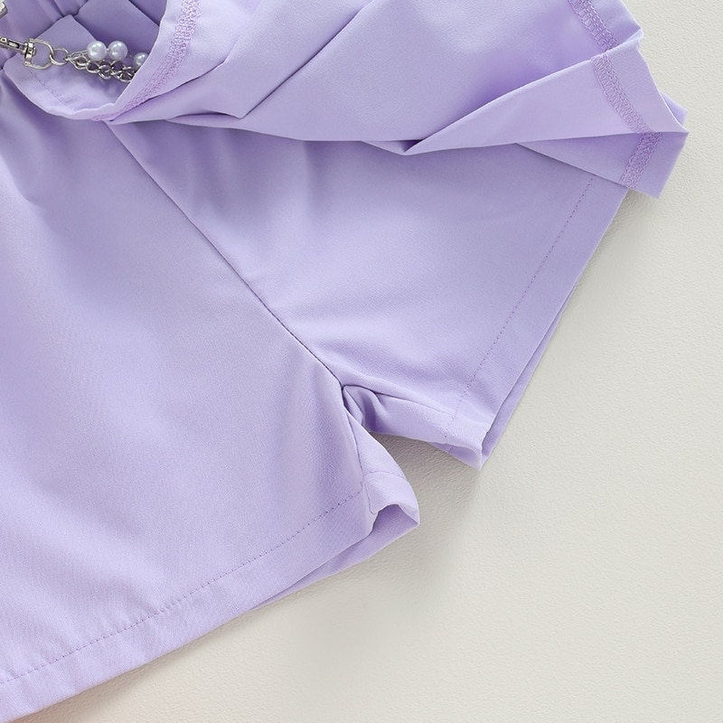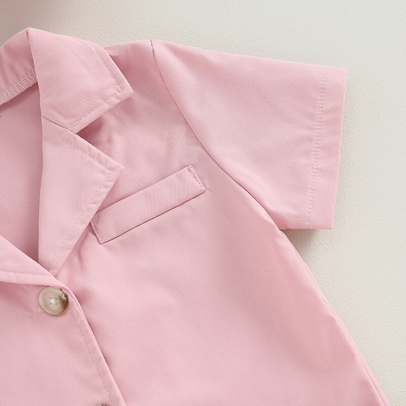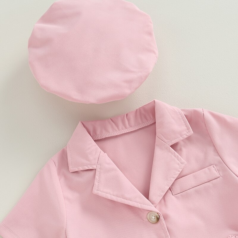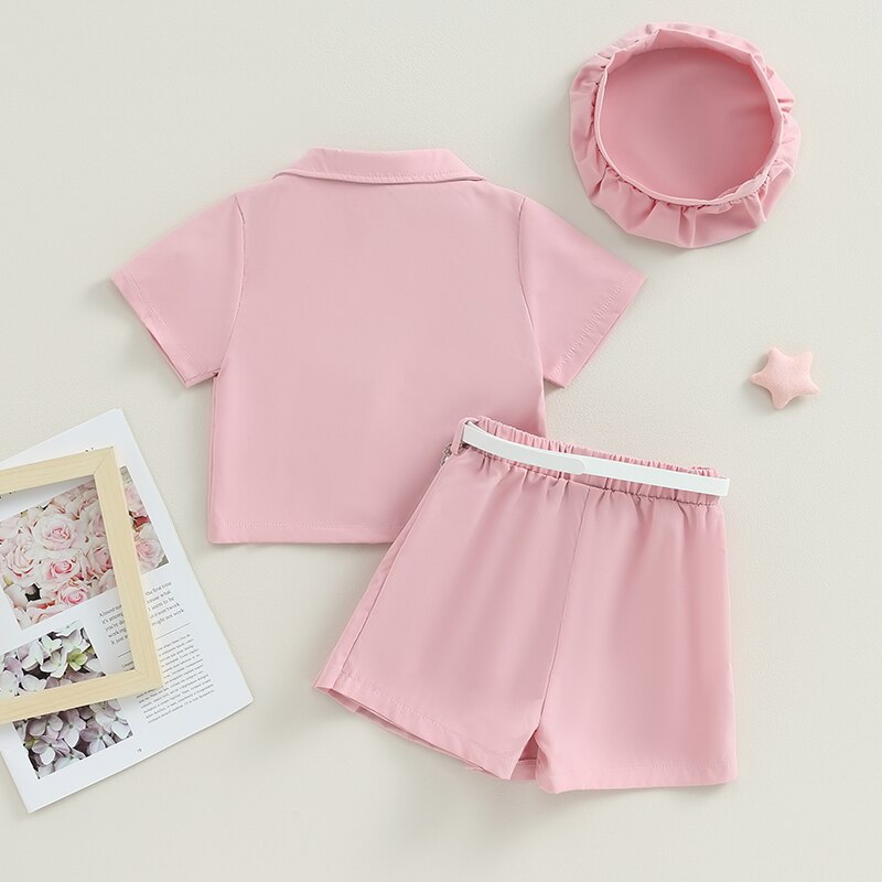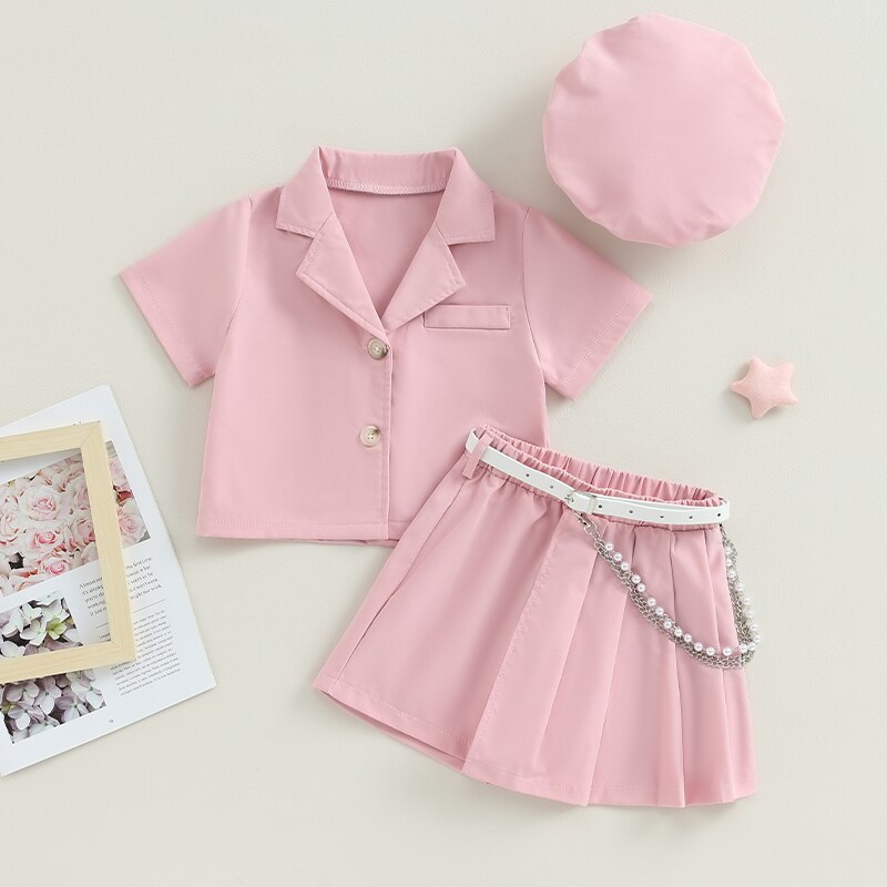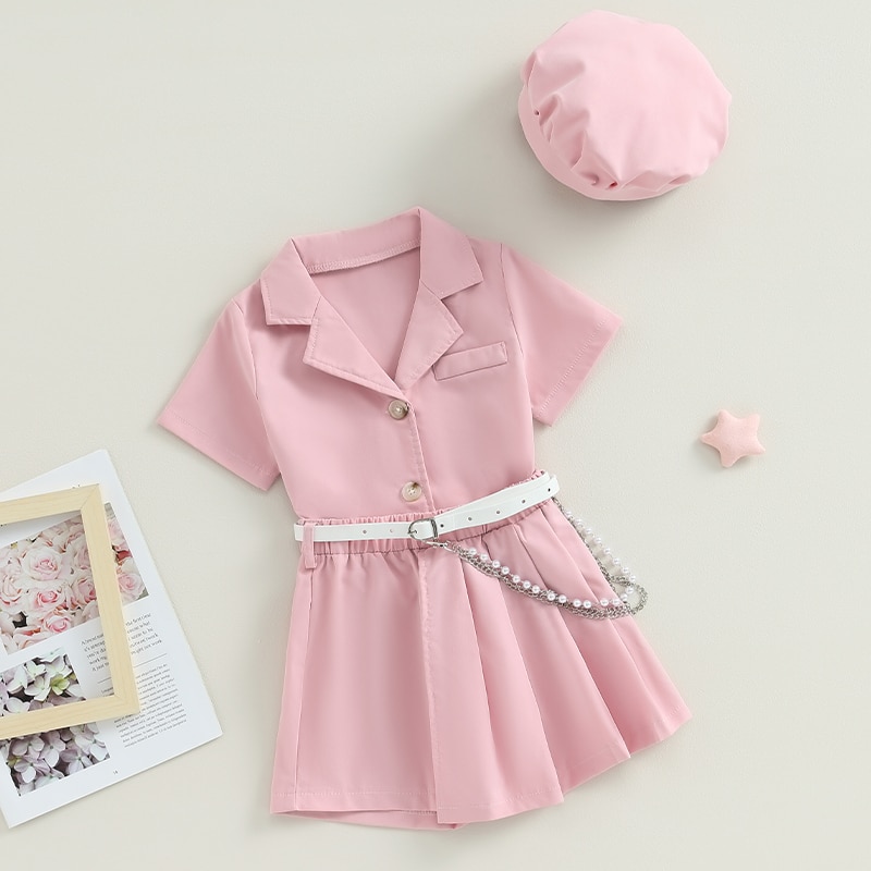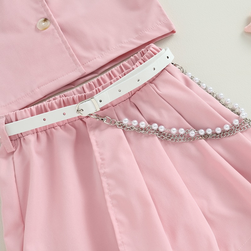 Сплошной цвет, воротник с лацканами, застежка на пуговицы, короткие рукава, летняя рубашка для девочек. Плиссированные костюм юбка с цепью талии и соответствующие милые шляпу является идеальным летом комплект одежды для вашей девушки.