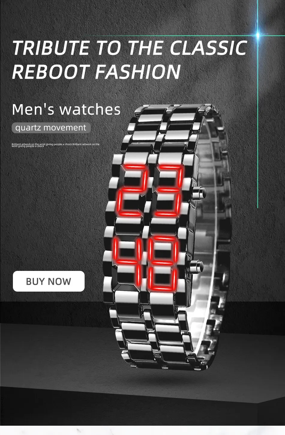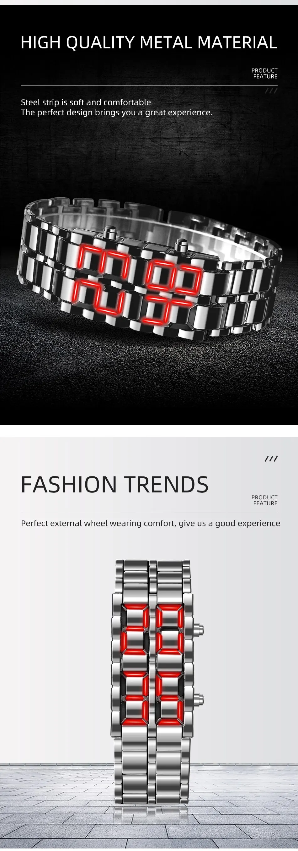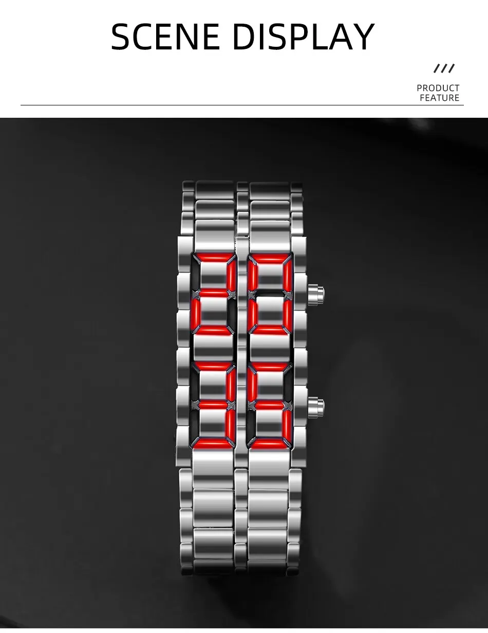 Светодиодные цифровые часы в нормальном состоянии выглядят как обычный металлический браслет, но темно-синий свет будет разливаться, как лава, во время освещения светодиода.