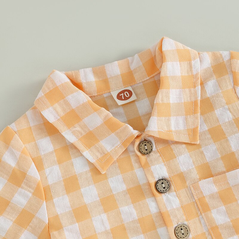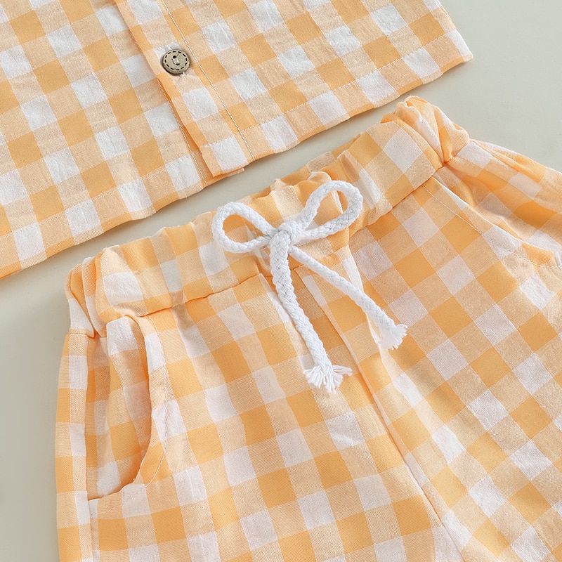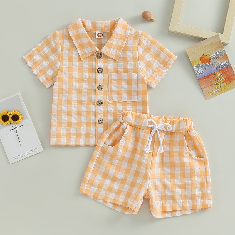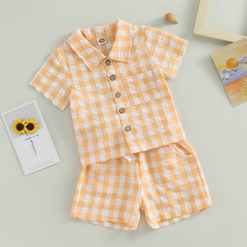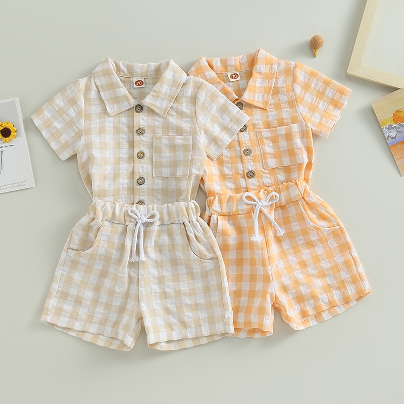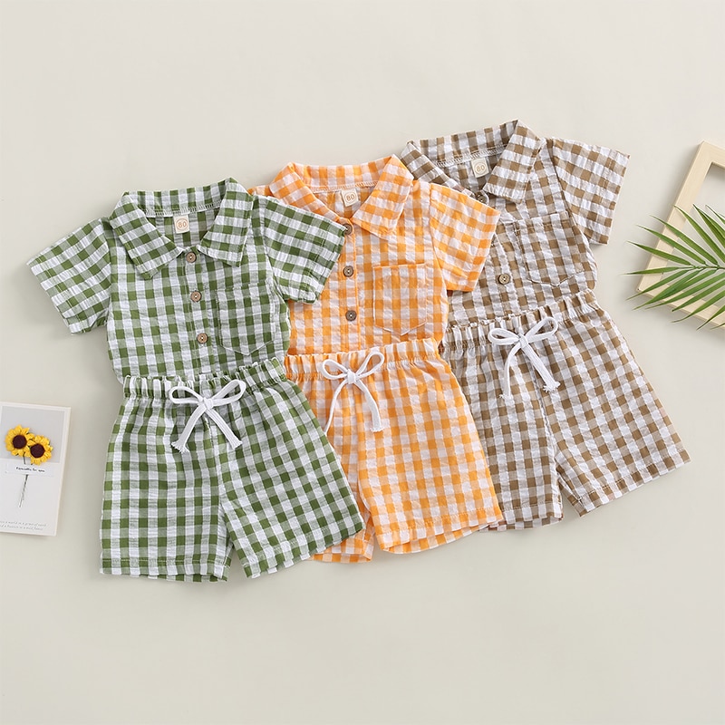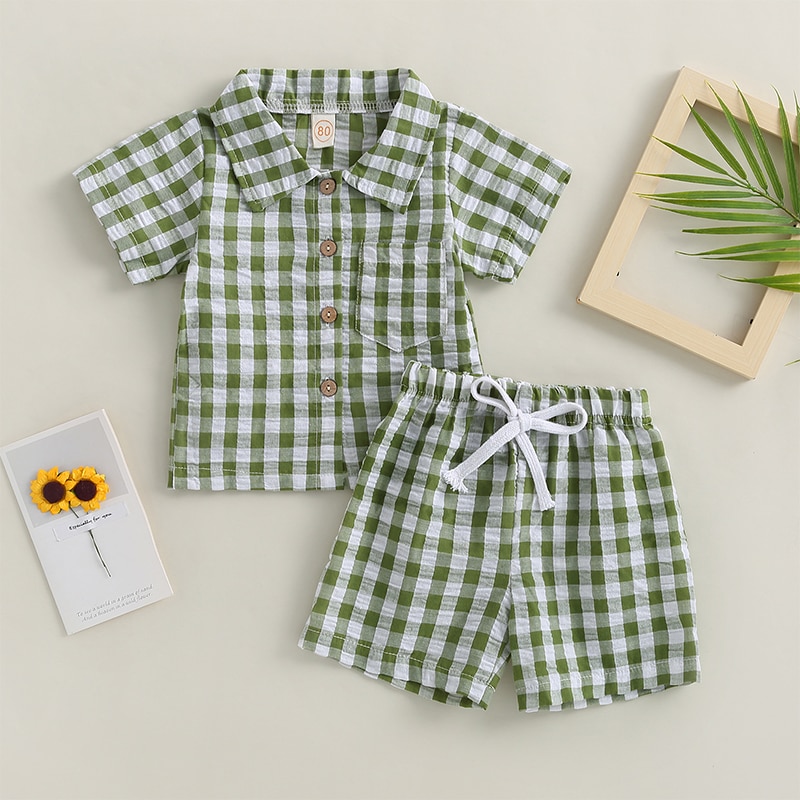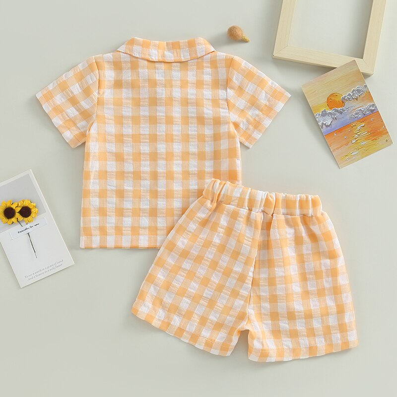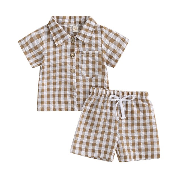 Модный клетчатый комплект из 2 предметов для маленьких мальчиков, шорты, рубашка с коротким рукавом и карманами + шорты на шнурке, Детский костюм, летняя одежда