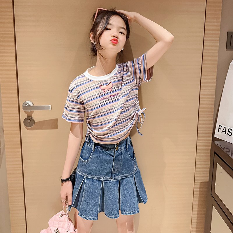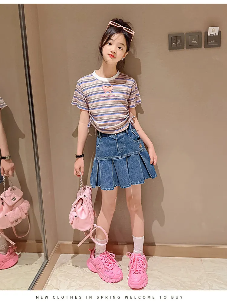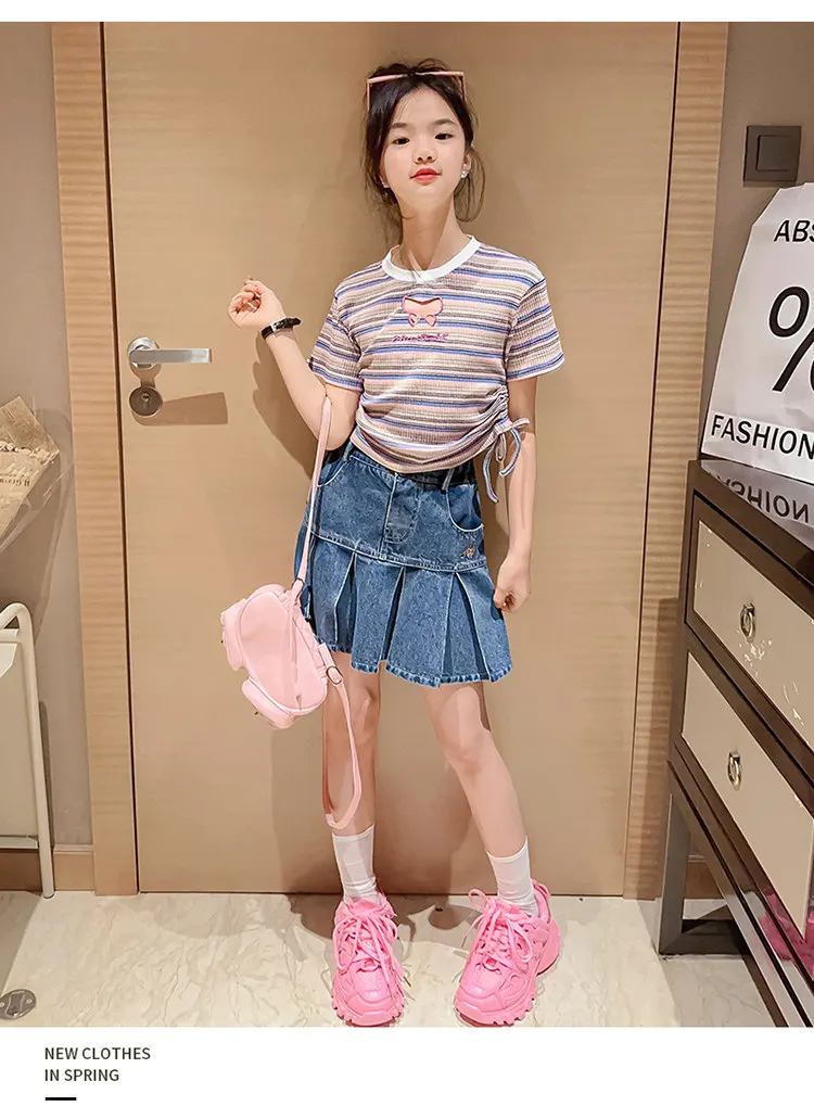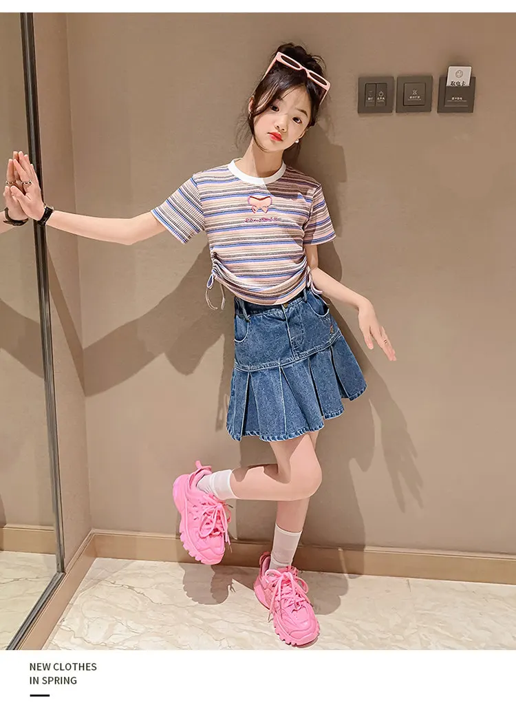 Модный комплект одежды для девочек, повседневный костюм, милый топ + джинсовая юбка из 2 предметов, летняя крутая Одежда для девочек 6, 8, 11, 13, 14 лет