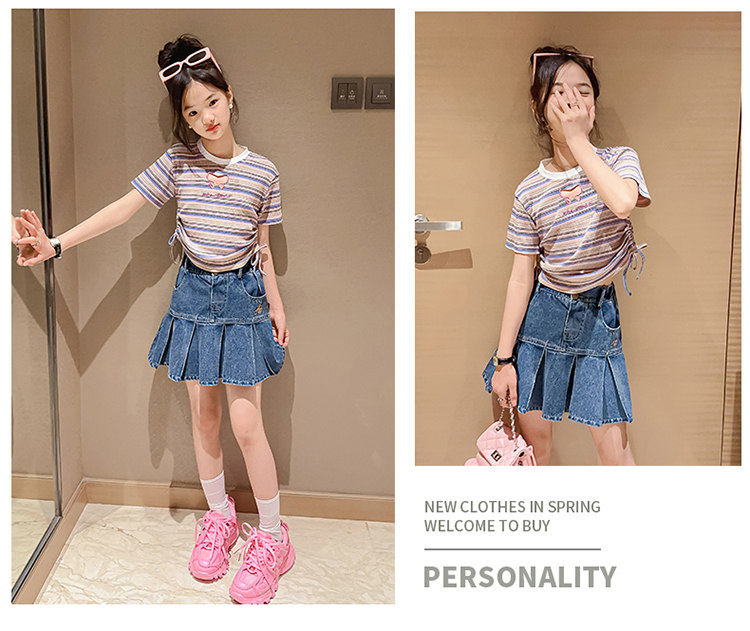 Комплект модной одежды для девочек, повседневный костюм, милый топ + джинсовая юбка из 2 предметов, летняя классная одежда для детей, девочек 6, 8, 11, 13, 14 лет