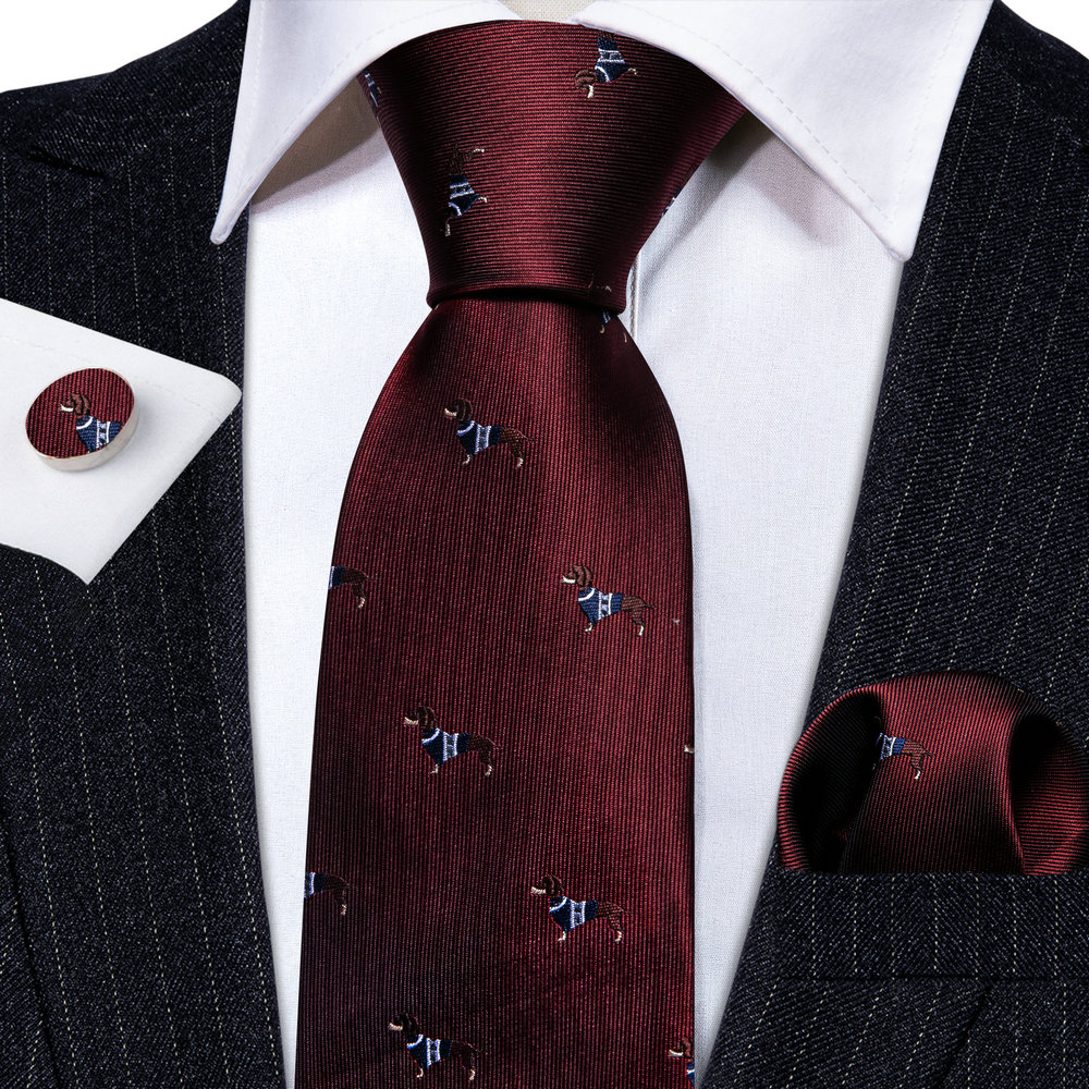 Fashion Red Burgundy Silk Cartoon Animal Men Tie Set Little Dog Wedding Necktie Handkerchief Cufflinks Brooches Barry. Wang