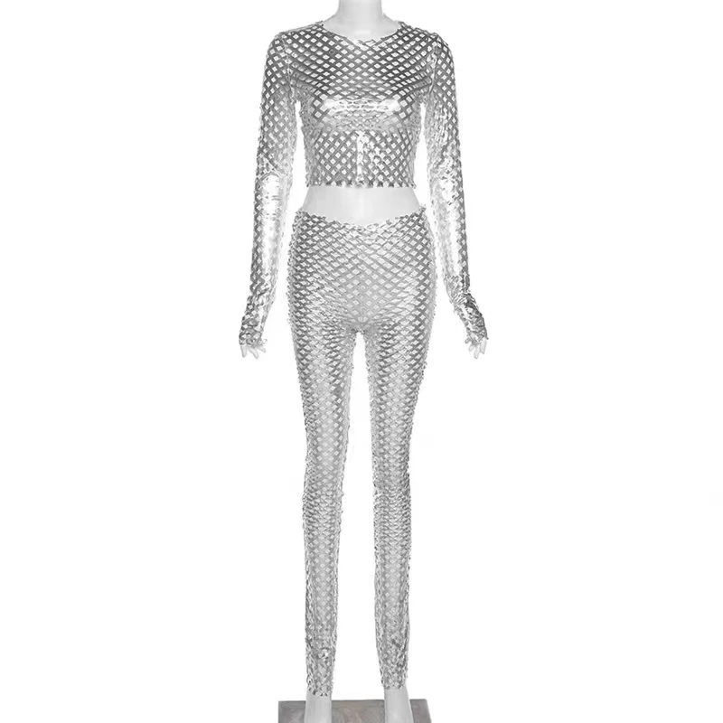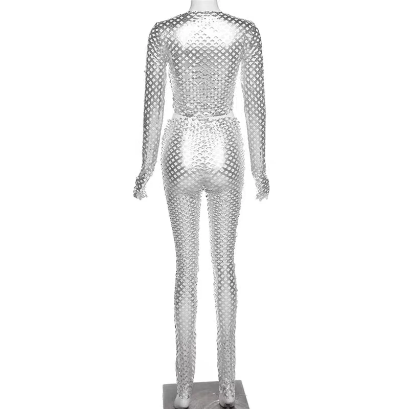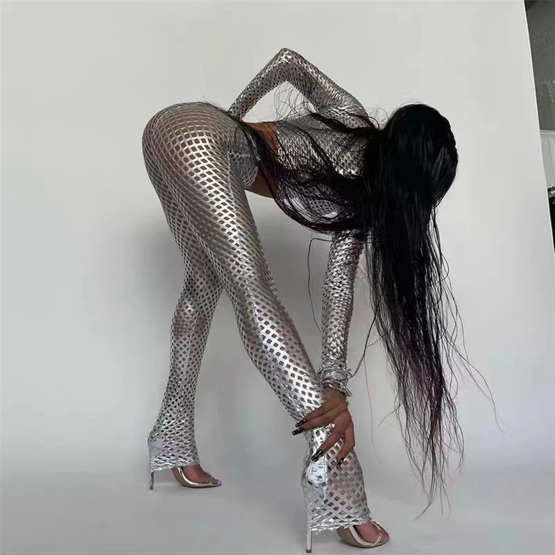 Модный облегающий брючный костюм Cyberpunk серебристый Яркий топ с отверстиями в европейском и американском стиле