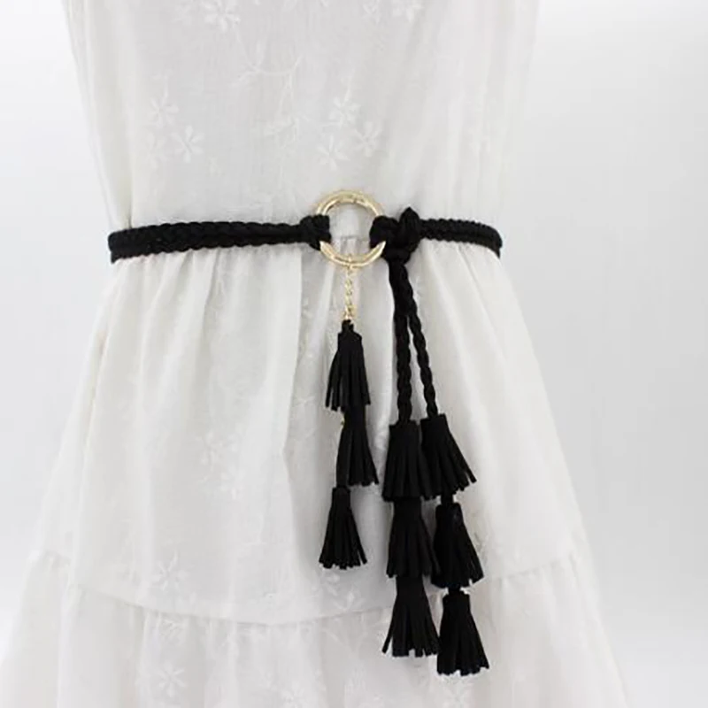 Модный женский однотонный плетеный ремень с кисточками, новинка 2023, тонкий поясной ремень для девочек в стиле бохо, вязаные ремни для платьев, пояса, аксессуары