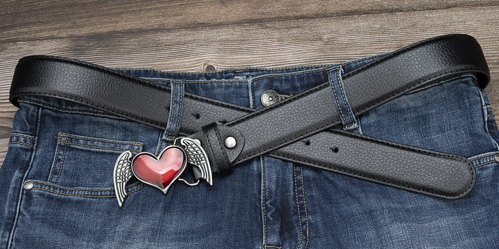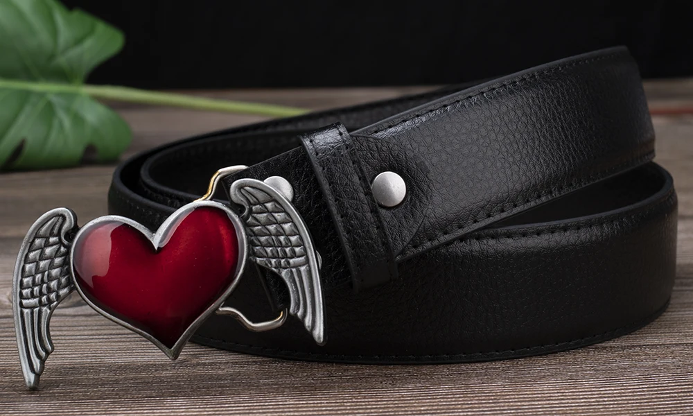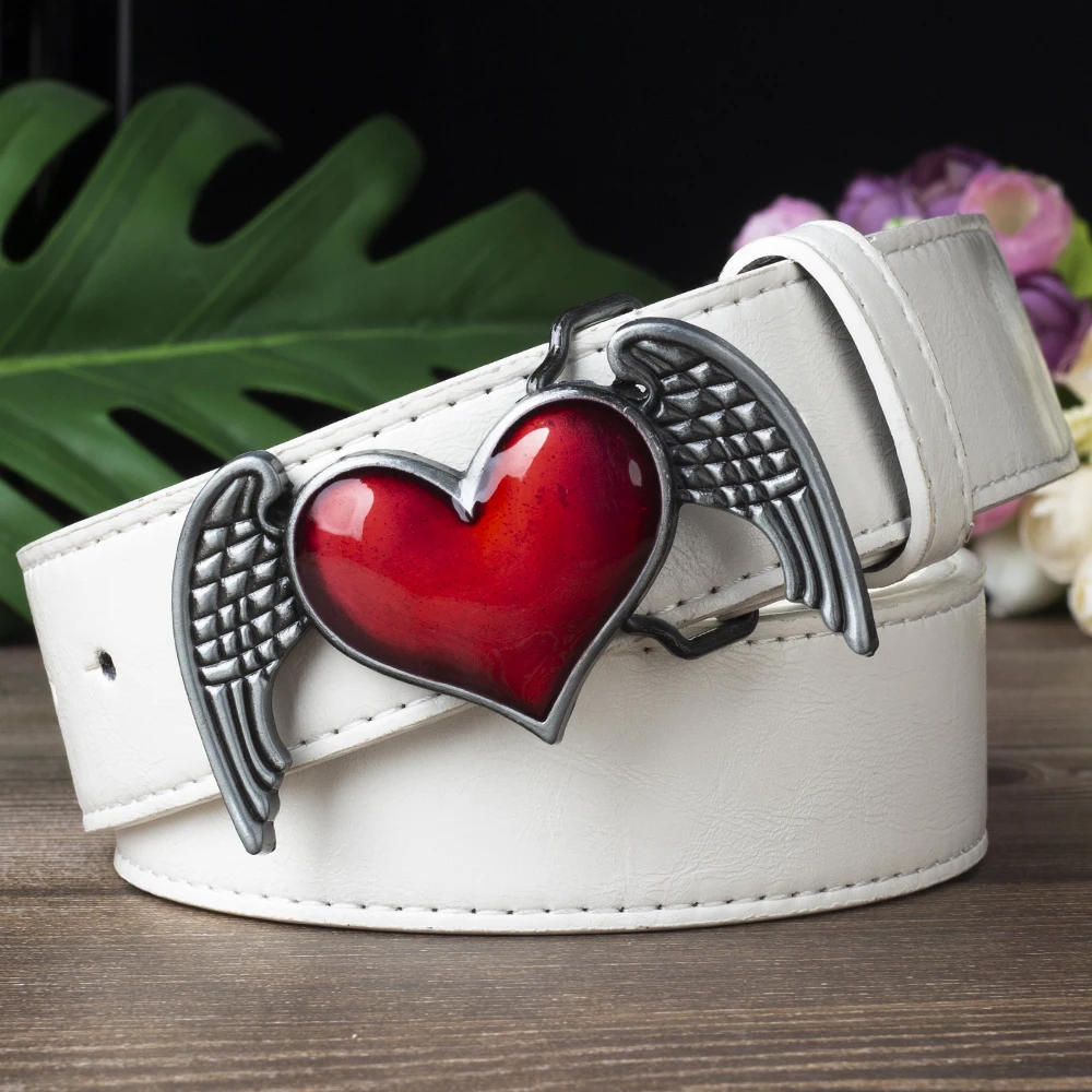 Модный женский ремень с пряжкой из сплава в виде красного сердца с крыльями белого цвета, повседневное украшение из искусственной кожи
