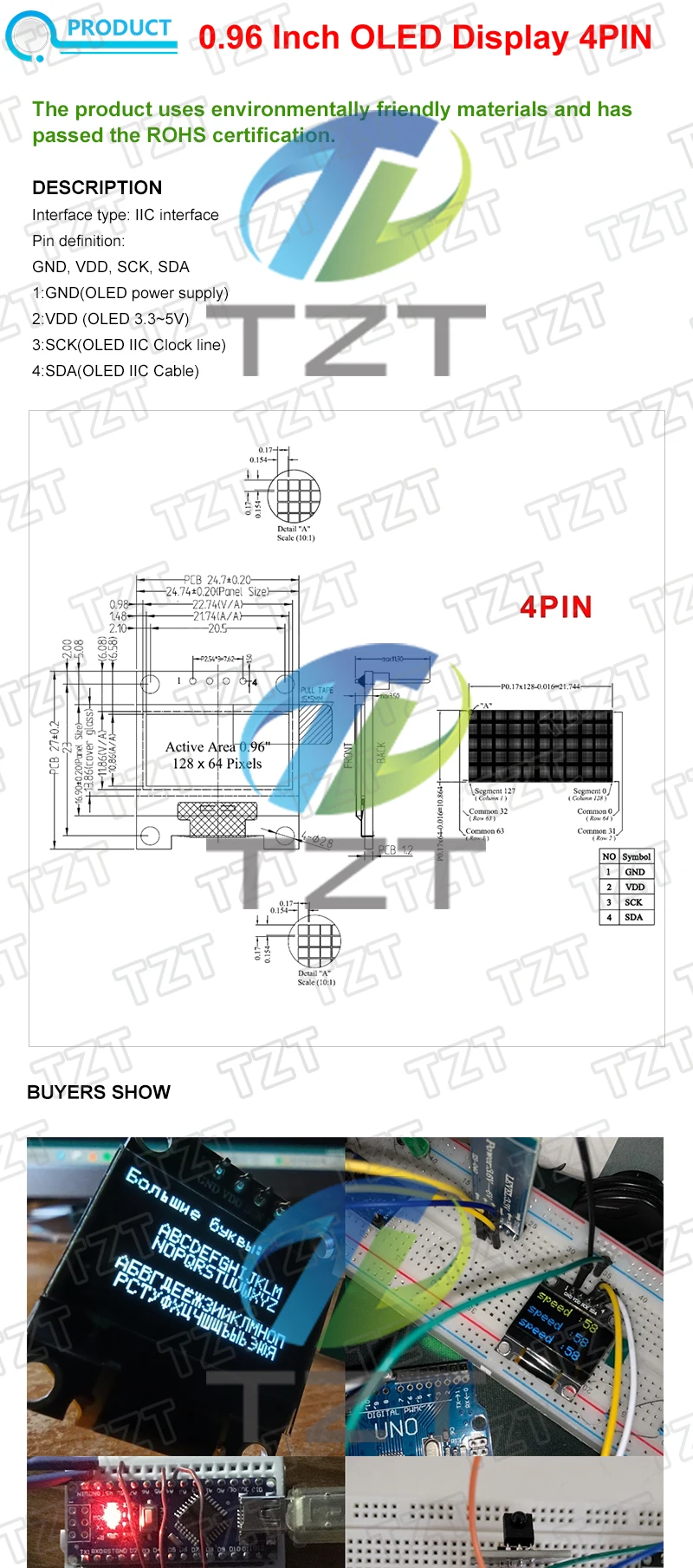 Модуль дисплея TZT с органическим светодиодом, 4pin, 0,96 дюйма, белый/синий/желтый/синий, OLED 0,96x64, 0,96 дюйма, для arduino