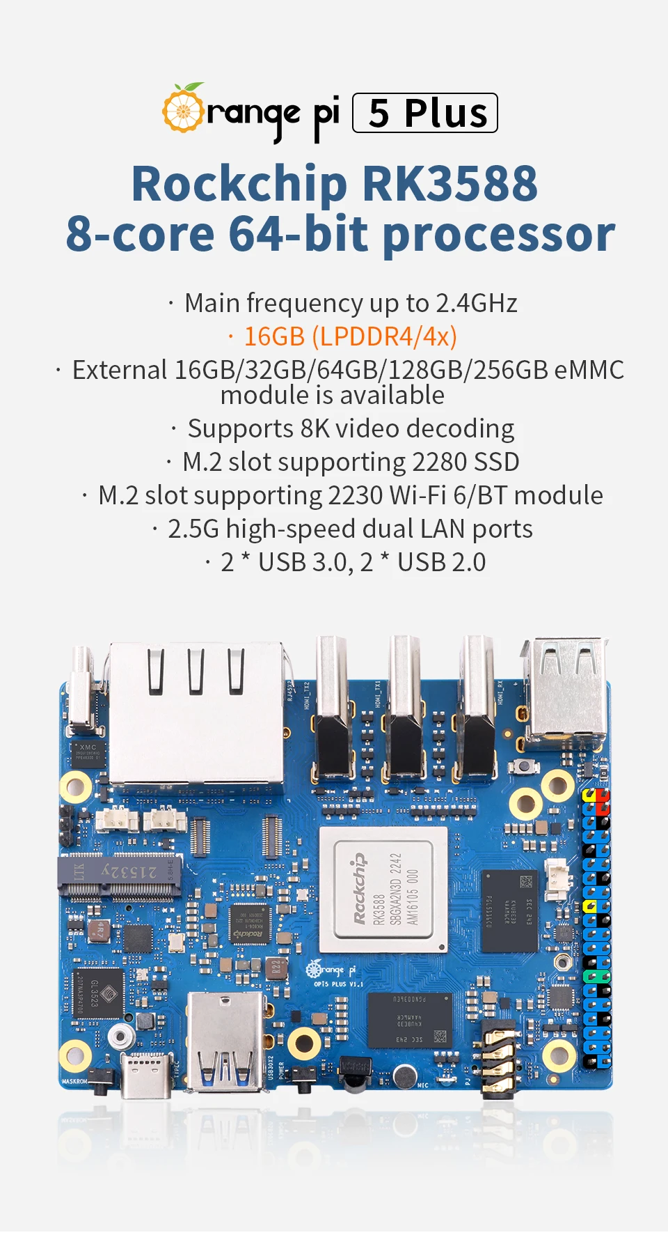 Модуль EMMC Orange Pi 5 Plus 16 ГБ + 256 ГБ, RK3588 2,5 ГБ, два порта Ethernet с расширением PCIE