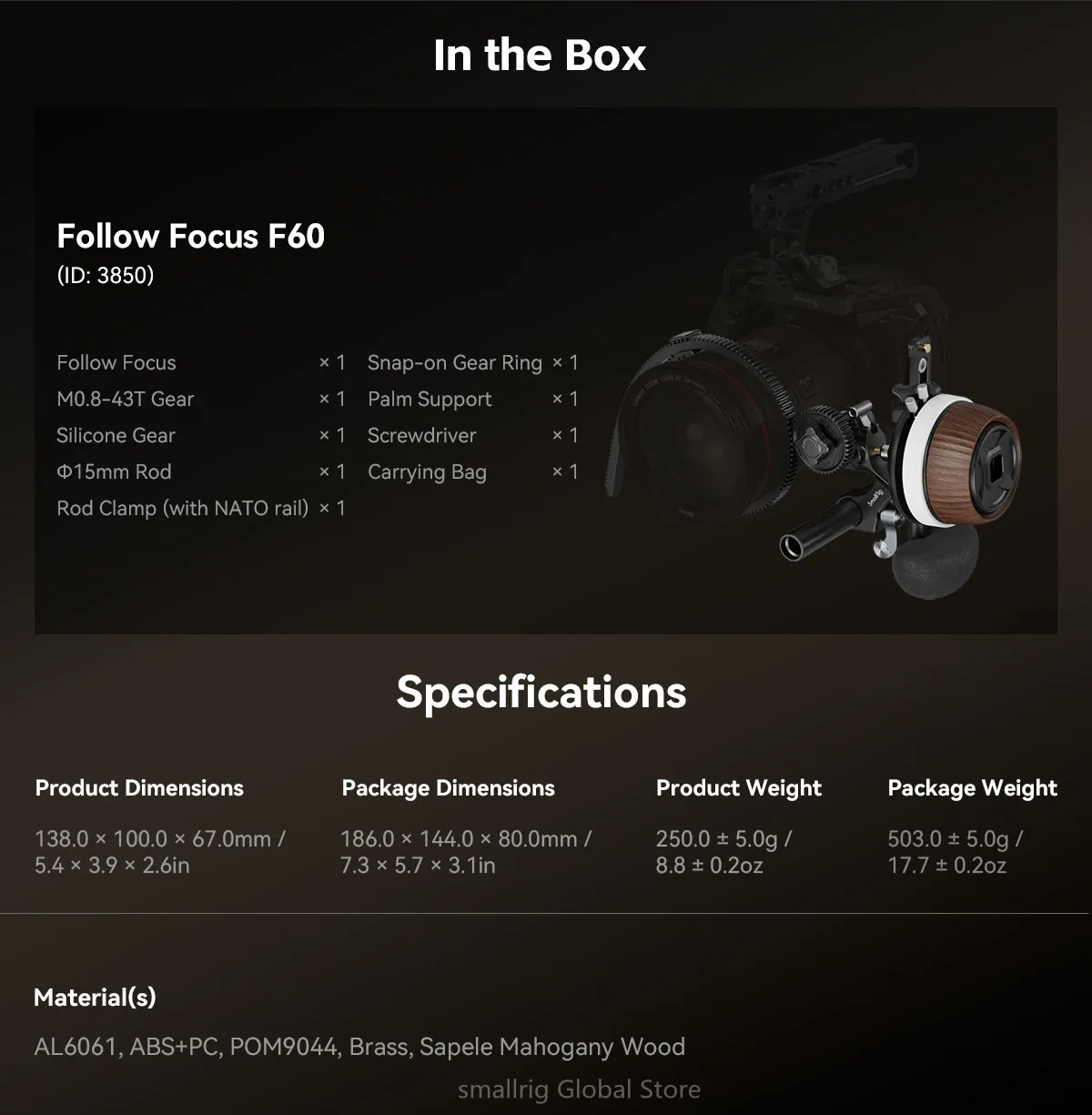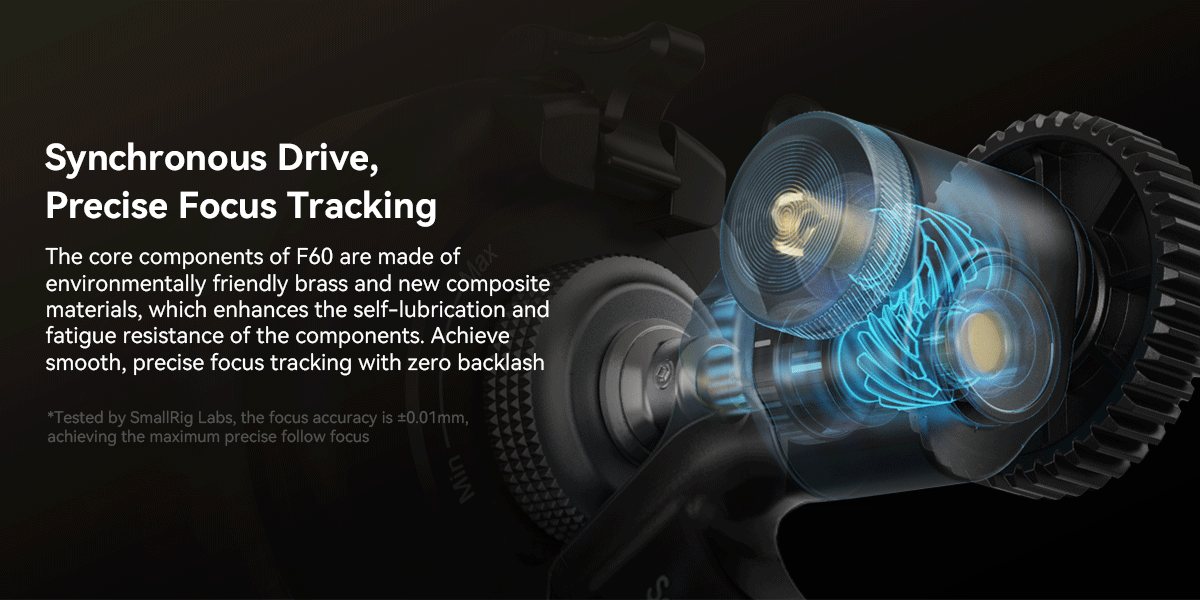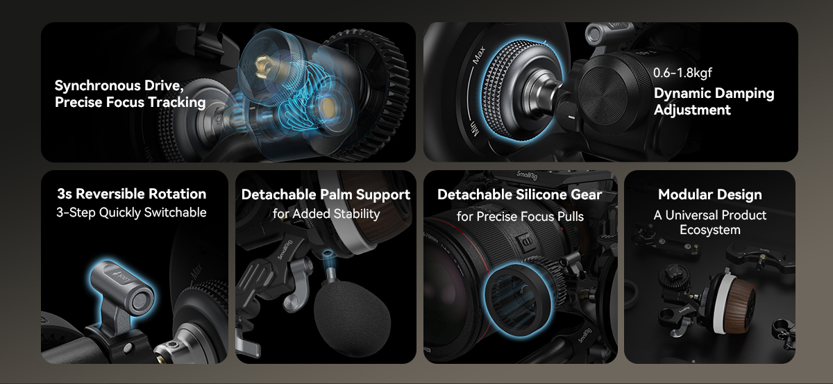 Модульный следящий фокус SmallRig F60 3850Предназначен для обеспечения точного и удобного управления фокусировкой объектива при видеосъемке. Модульный следящий фокус, основной привод которого изготовлен из экологически чистой латуни и суперкомпозитного материала, обеспечивает точную настройку для улучшения работы. Он поддерживает линзы различного демпфирования благодаря инновационной, регулируемой бесступенчатой системе демпфирования (коэффициент динамического демпфирования: 0,6 kgf-1.8 кгс). 3-ступенчатый переключатель между прямым и обратным вращением, а также 2-ступенчатые остановки A/B, установка и отпускание позволяют увеличивать на 360 °. Его модульные аксессуары включают силиконовую шестерню ( Код: 3852), Который напрямую управляет фокусом объектива за счет трения, быстросъемная опора для ладони, обеспечивающая стабильность при съемке с рук; и дополнительный одинарный и двойной 15-миллиметровый стержневой зажим ( Код: 4151) И часть адаптера фокусировки (ID: 3851), все совместимы с системой аксессуаров SmallRig.