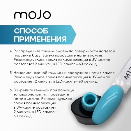 Описание: MOJO - это высокопигментированные трёхфазные гель лаки с оптимальной самовыравнивающейся консистенцией и мягкой кисточкой. Великолепная палитра самых топовых оттенков для создания стойкого и красивого маникюра. Вся продукция марки MOJO сертифицирована, имеет гипоаллергенный состав и плотную пигментацию. При нанесении гель лак не полосит, не растекается, а также не требует запечатывания торца ногтя. Гель лаки MOJO образуют липкий слой, снимаются без вреда для ногтевой пластины. Гарантия стойкости 14 дней. MOJO - великолепное качество по приятной цене!