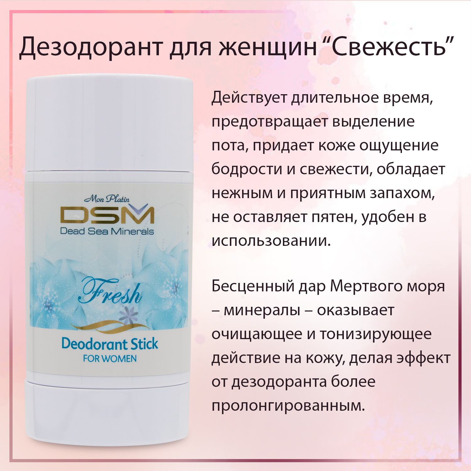 Описание: Дезодорант действует длительное время, предотвращает выделение пота, придает коже ощущение бодрости и свежести, обладает нежным и приятным запахом, не оставляет пятен, удобен в использовании.Бесценный дар мертвого моря – минералы – оказывает очищающее и тонизирующее действие на кожу, делая эффект от дезодоранта более пролонгированным. Сбалансированная формула препарата эффективно защищает от продуктов жизнедеятельности бактерий. Кроме того, в состав дезодоранта входят вещества, восстанавливающие роговой слой эпидермиса, на котором имеются микроповреждения в результате регулярного бритья. Активные компоненты: минералы Мертвого моря. Неприятный запах от подмышек – это не только отталкивающе, но и просто неприлично! Тем более сейчас, когда есть прекрасное средство, эффективно справляющееся с этой проблемой – дезодорант «Свежесть», произведенный в Израиле. Его нежный женственный запах сочетается с высокой эффективностью. Дезодорант прост и неприхотлив в применении. Он на долгое время обеспечивает отсутствие неприятного запаха, придает коже бодрость и свежесть.
