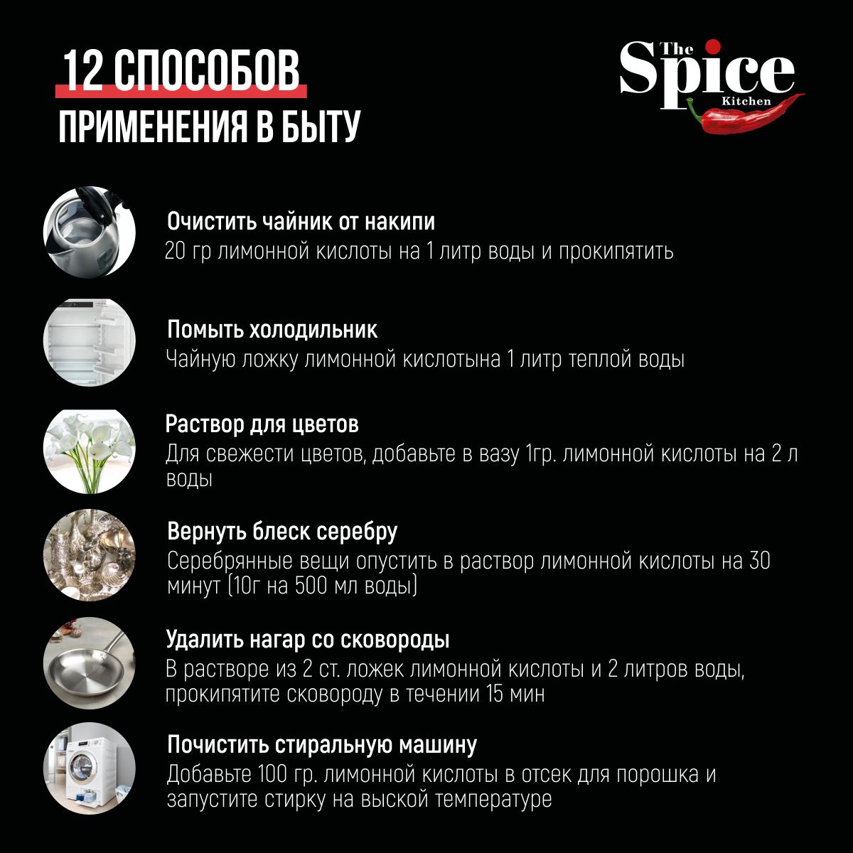 Многие домохозяйки используют данный химический реактив для очищения стиральных машин, утюгов и чайников от накипи и налета, в качестве пятновыводителя на тканях от ржавчины, чернил, вина, красок и т.д.. Применяют для чистки серебра, поэтому лимонная кислота входит в состав многих чистящих средств.