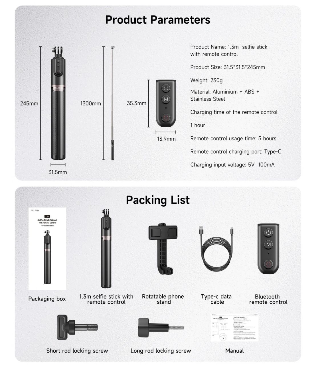 ⁃ Селфи палка с дистанционным управлением ⁃ Вращающая подставка для телефона ⁃ Кабель Туре-С ⁃ Bluetooth-пульт ⁃ Фиксирующий винт короткого стержня ⁃ Стопорный винт
