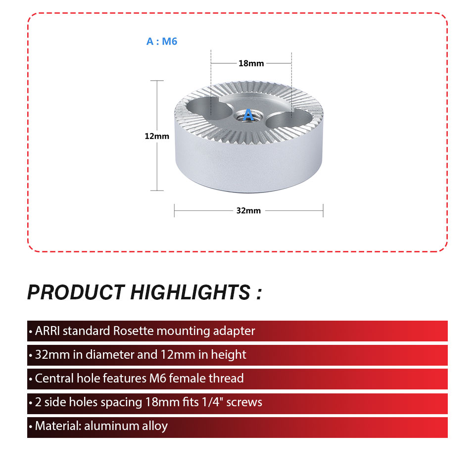 • Он строго соответствует спецификации ARRI Rosette и хорошо изготовлен из алюминиевого сплава, он очень многофункциональный и прочный.