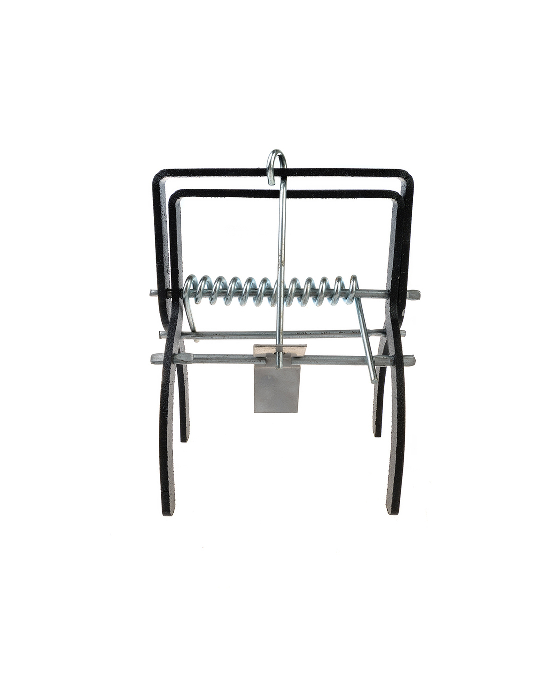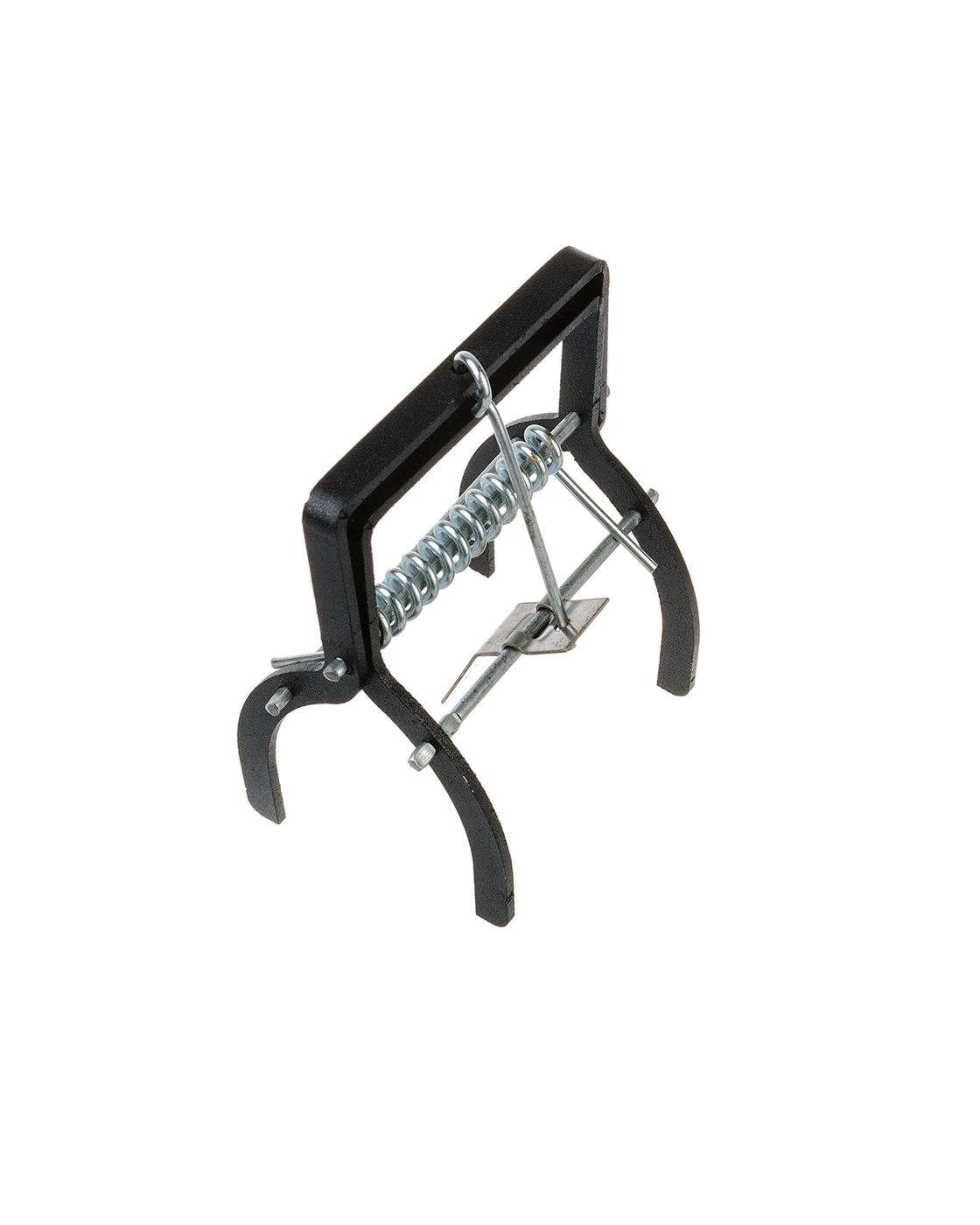 • Взведите кротоловку Спрут: сожмите верхние части капкана вместе, преодолевая сопротивление пружины (удобнее всего это делать, нажав ногой на рычаг кротоловки, лежащей на земле). Зафиксируйте конец сторожка, вставив его в отверстие на пластине (на самый кончик, не более 1 мм, чтобы при небольшом усилии на пластину сторожок соскочил из отверстия и капкан сработал).