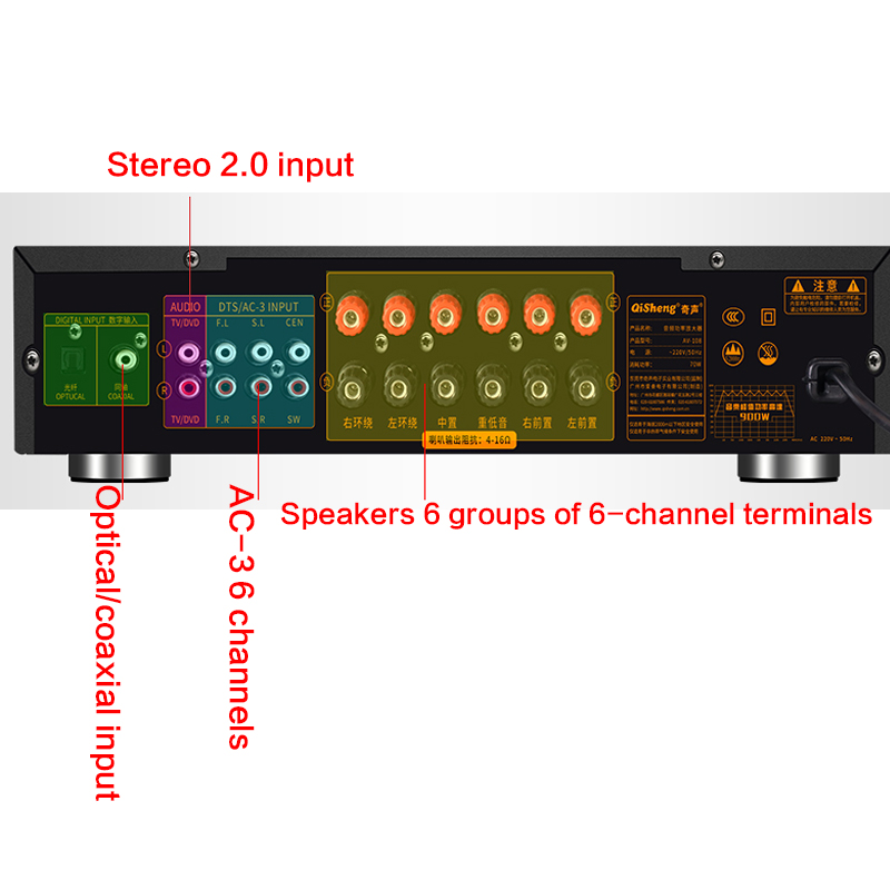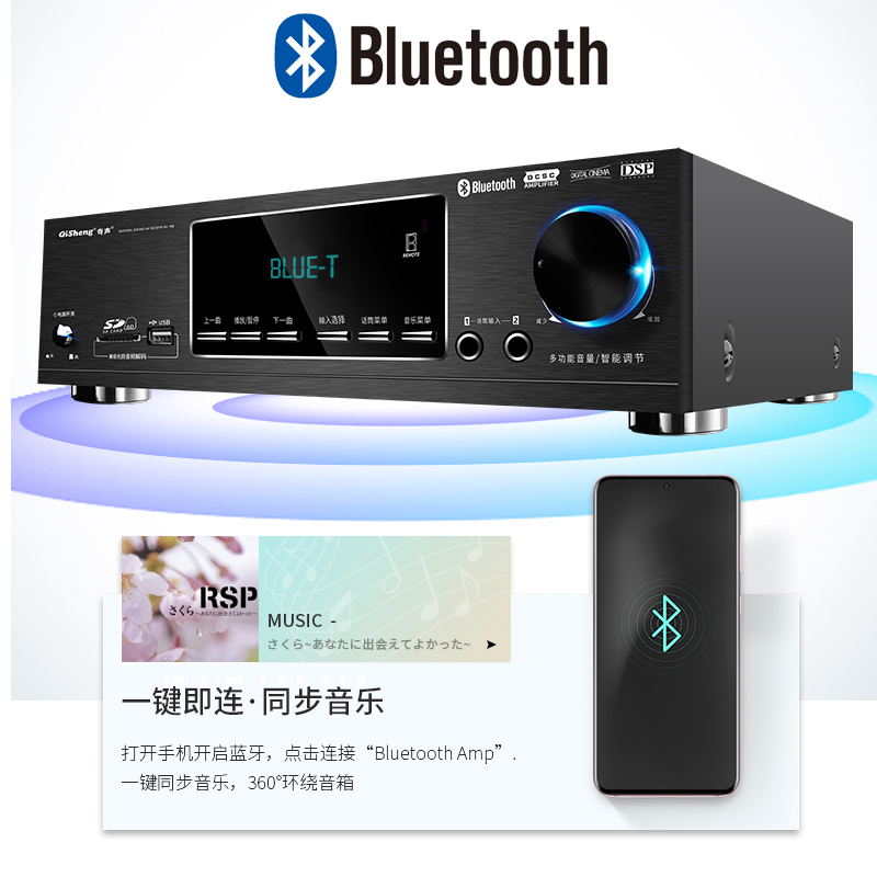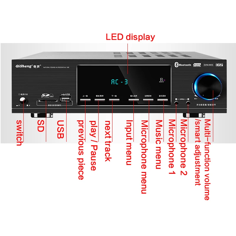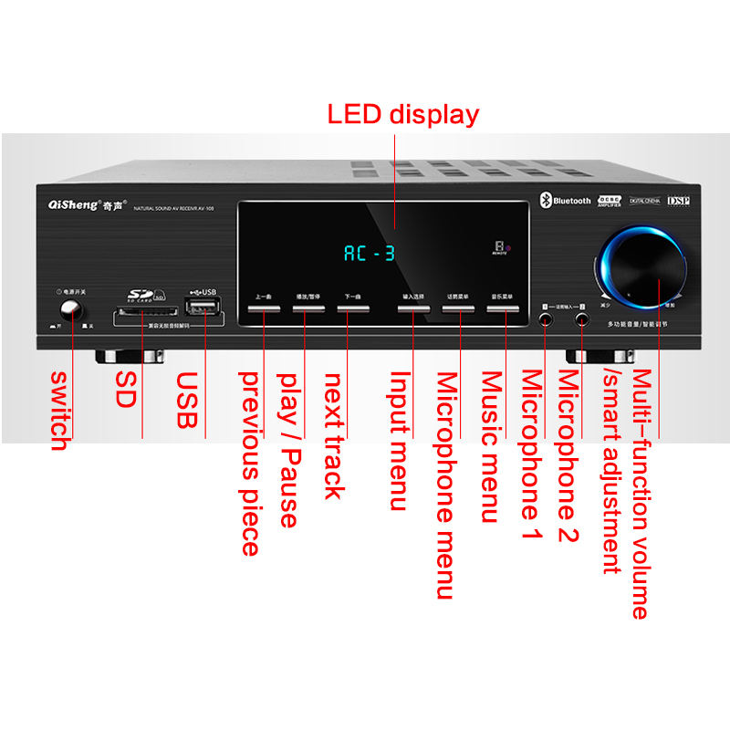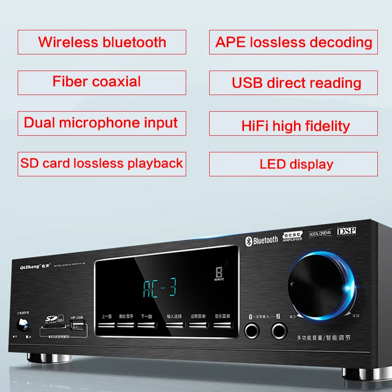 Функция: беспроводное декодирование Bluetooth/APE без потерь/Оптическое коаксиальное/прямое считывание USB/двойной вход микрофона/HiFi Высокая точность/воспроизведение без потерь sd-карты/светодиодный дисплей и т. д.