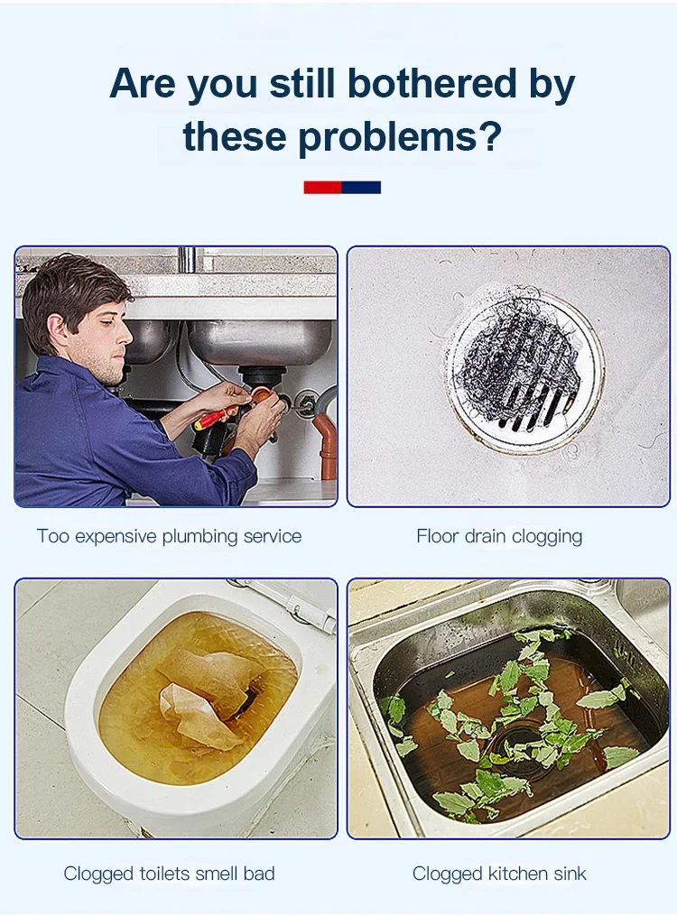 Получите Наш мощный агент Дноуглубительных труб! Легко решите три основные проблемы головной боли: засорение раковины, засорение слива в полу и засорение унитаза!