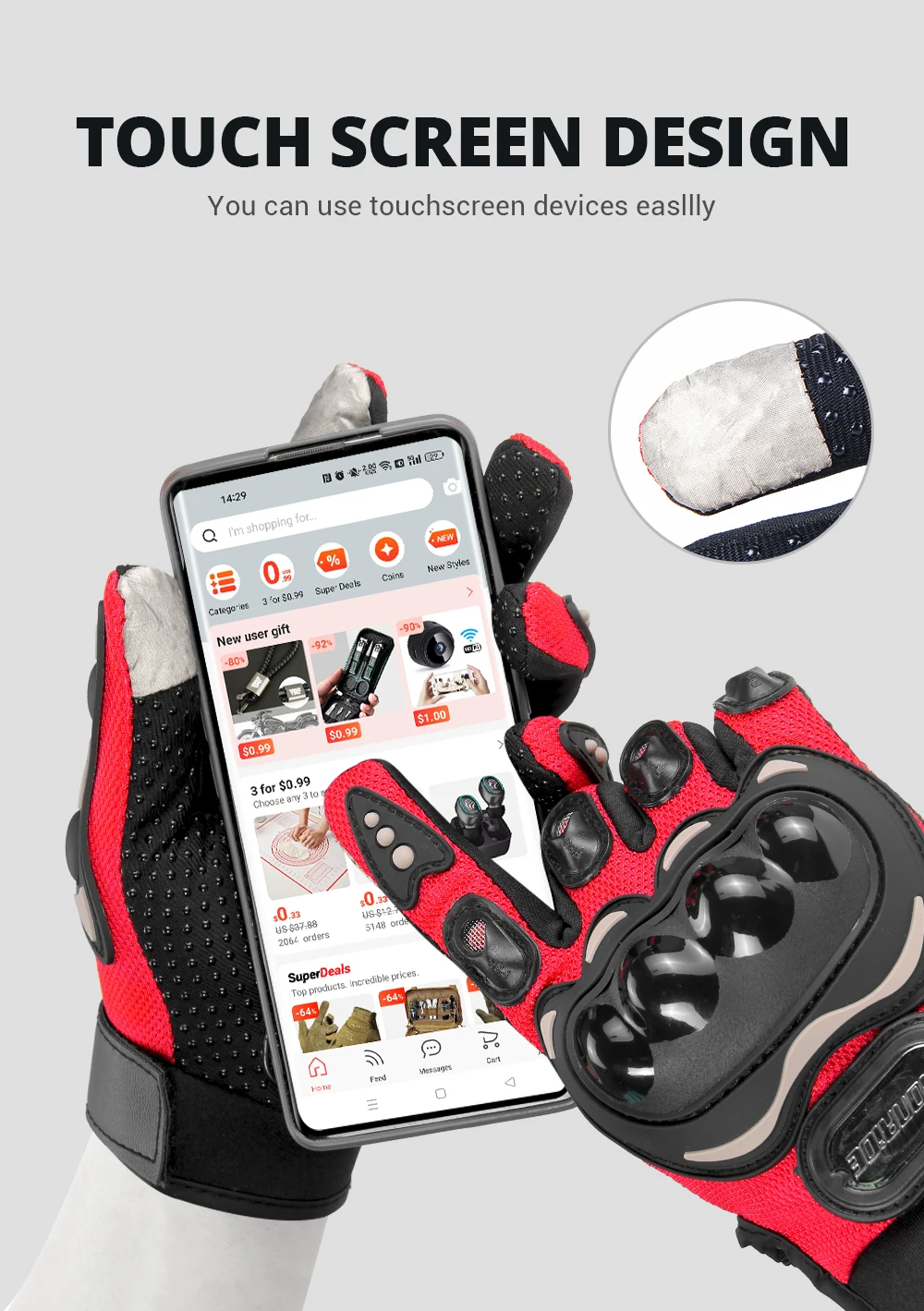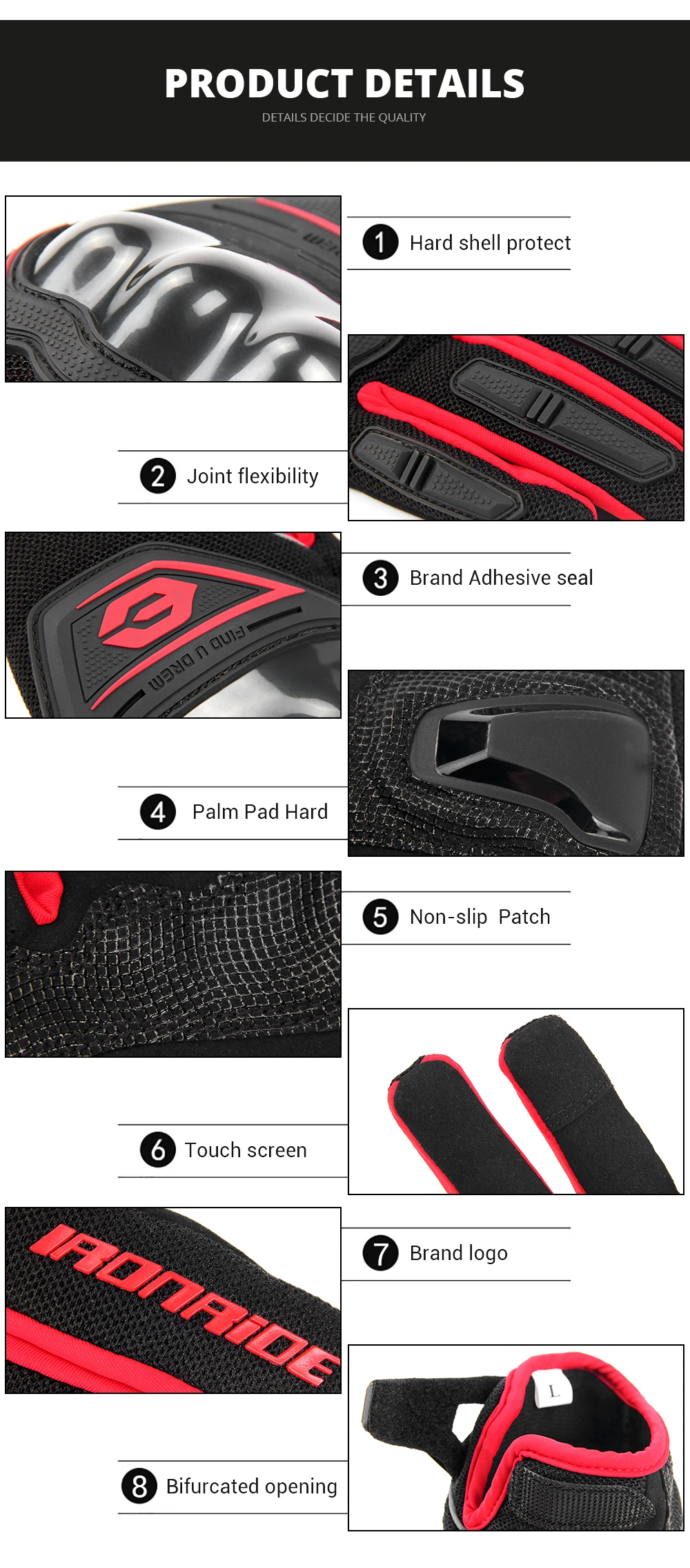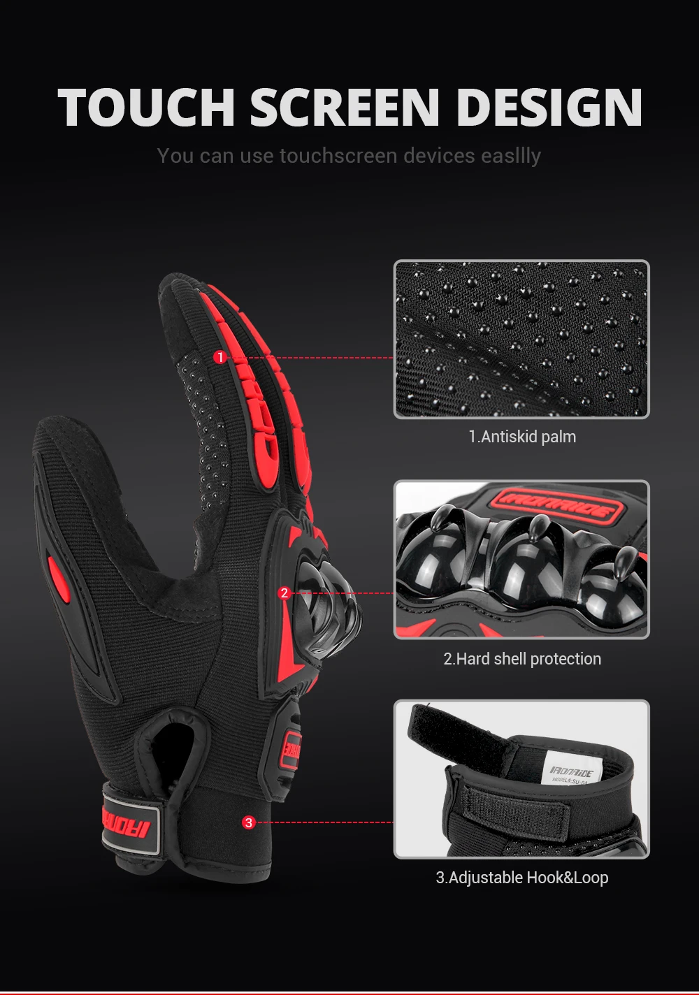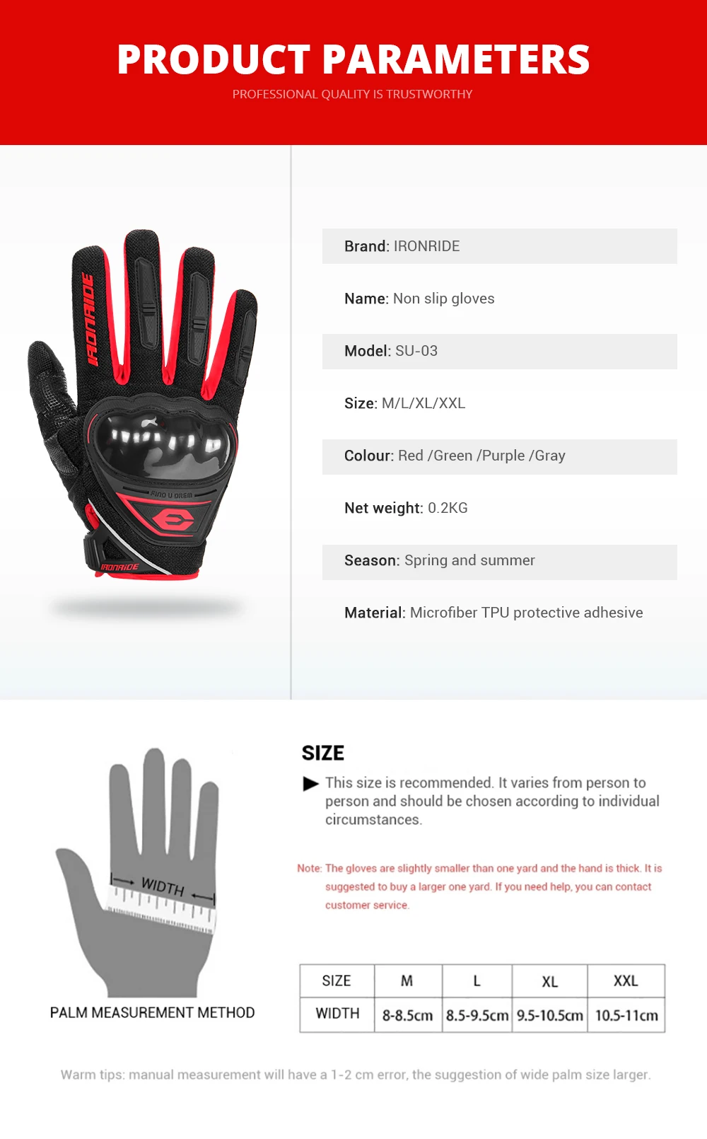 3.Touch screen finger design, sensitive touch.4.Suitable for motorcycle cross-country race, cycling, fishing, rock climbing and other outdoor sports5.Model Number: SU-01Material: Nylon + super fiberColor: Red, Black, Grey, Purple, Green, OrangeGender: neutral, both male and femaleSize: M, L, XL, XXLSeason: Spring, Summer,Autumn