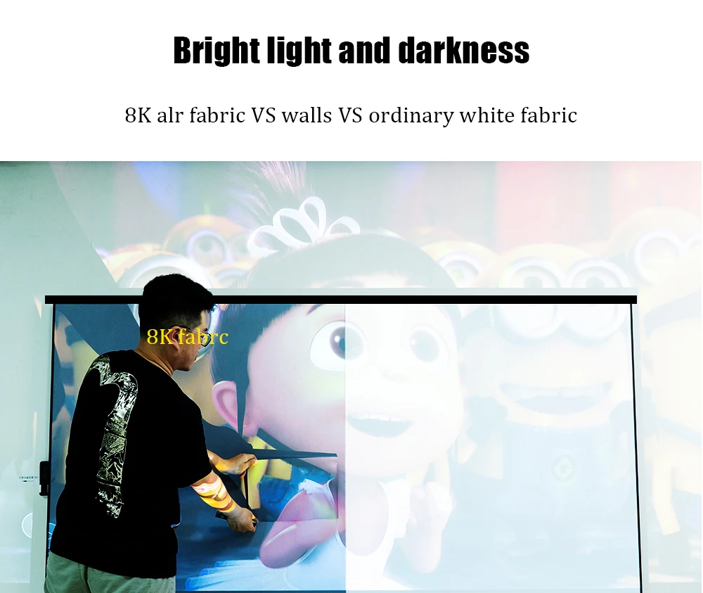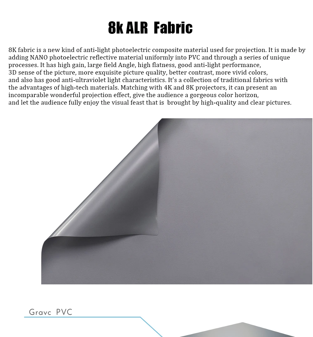 Ткань 8K ALR-это новый вид светоэлектрического композитного материала, используемого для проекции. Он производится путем равномерного добавления фотоэлектрического отражающего материала NANO в ПВХ и с помощью ряда уникальных процессов. Он имеет высокое усиление, большой угол поля зрения, высокую плоскостность, хорошие анти-световые характеристики, 3D-ощущение изображения, более изысканное качество изображения, лучшую контрастность, более яркие цвета, а также имеет хорошие характеристики защиты от ультрафиолета. 8К ALR ткань 70% подавление окружающего света. Усиление 1,1, Разрешение 8K, Контрастность 15000:1, Воспроизведение цвета 98.5%, Угол обзора 140 °.