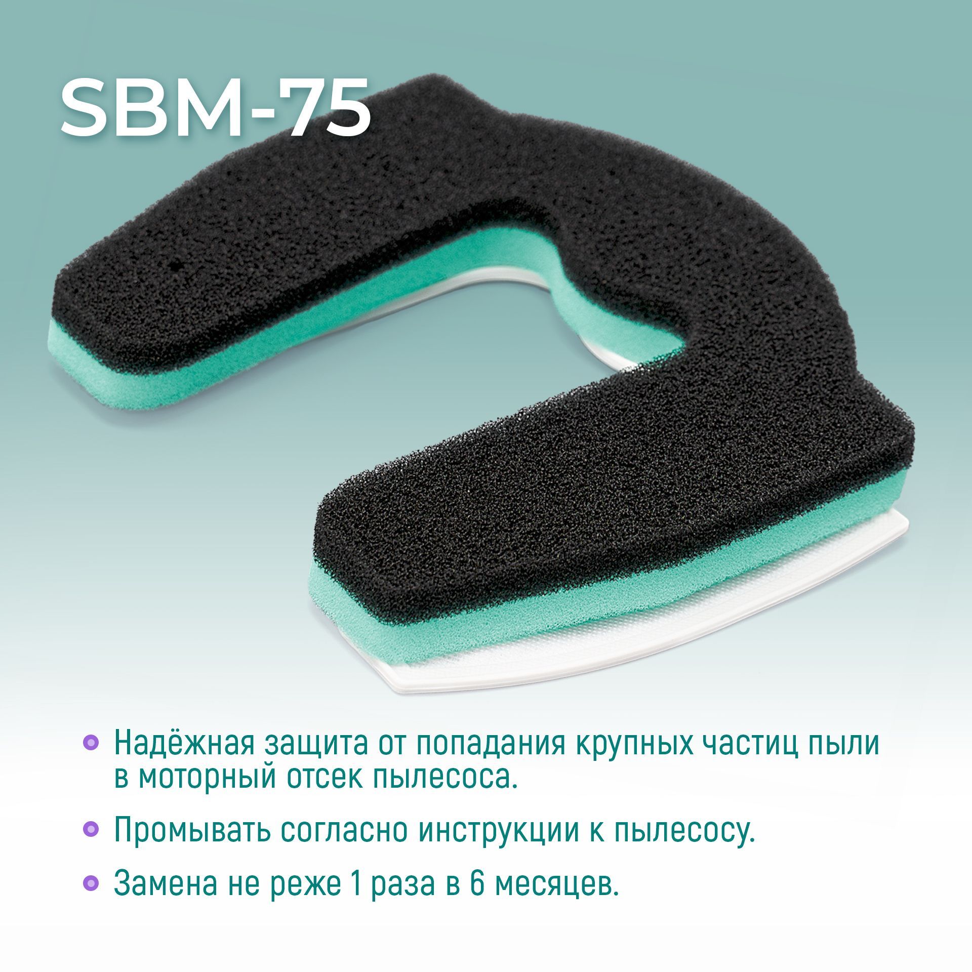 Фильтр надежно защищает мотор Вашего пылесоса от попадания мелких частиц пыли и грязи, имея уровень очистки воздуха до 99.5%.