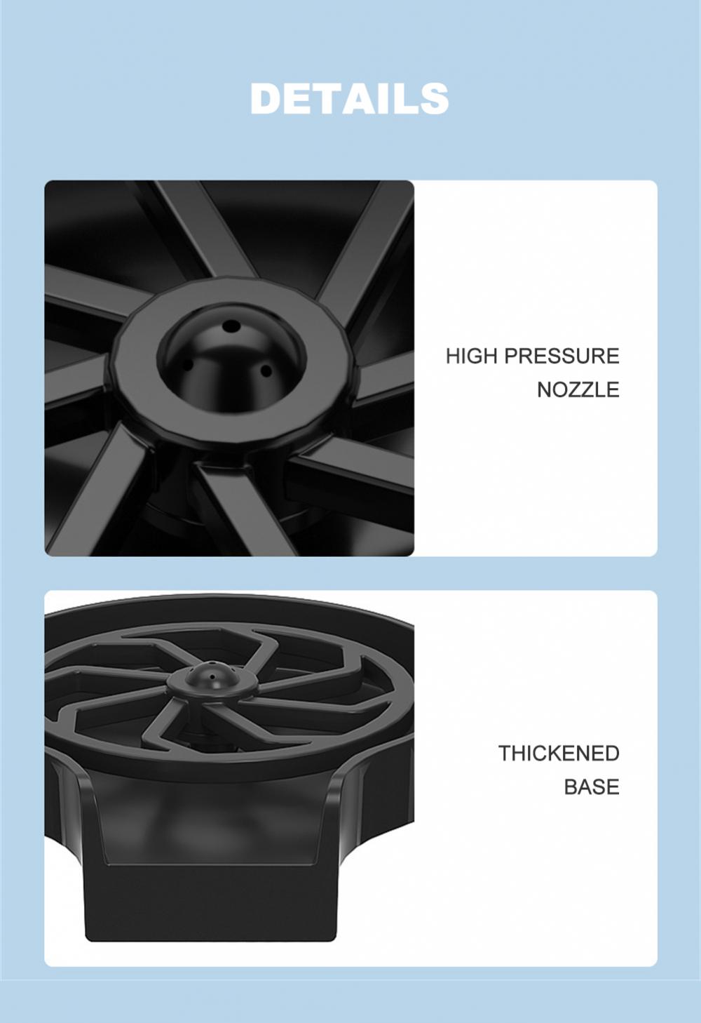 Простота использования: Опустите горлышко чашки вниз, слегка нажмите на дно чашки, она автоматически распылит воду для очистки, после того, как чашка будет очищена, снимите чашку и прекратите распылять воду.