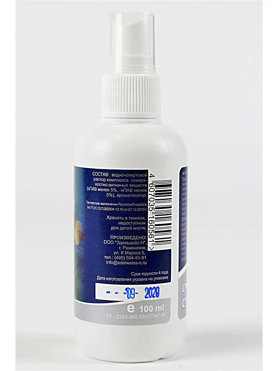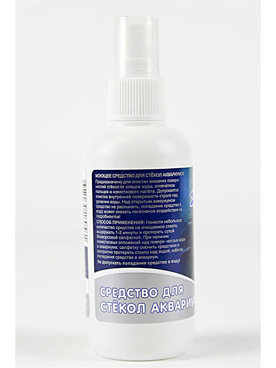 Описание: Переназначено для очистки внешних поверхностей стекол аквариумов и террариумов от следов воды, отпечатков пальцев, известкового налета. Допускается очистка (уброрки) на внутренней поверхности над уровнем воды. Над открытым аквариумом средство не распылять. Не допускать попадания средства в воду аквариума с рыбами или террариум. Объем: 100 мл. Дозатор - кнопочный распылитель. Жидкость можно наносить при помощи тряпки, губки. Также можно чистить аксессуары аквариумистика (крышка, лампа).