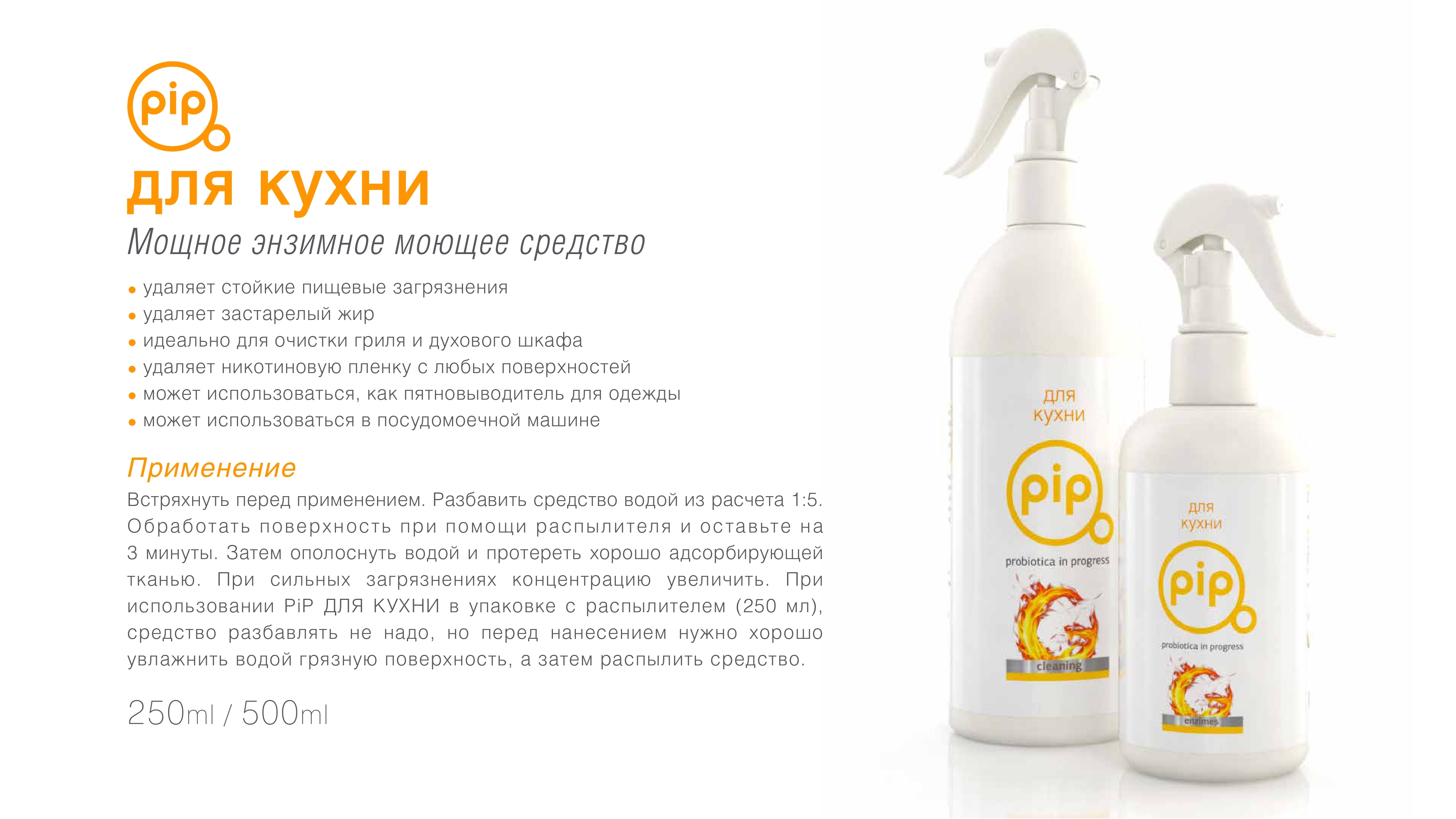 PIP «Для Кухни» поможет легко справится даже со стойкими въевшимися загрязнениями в местах приготовления пищи. Средство экономично при использовании, так как имеет высококонцентрированную формулу.