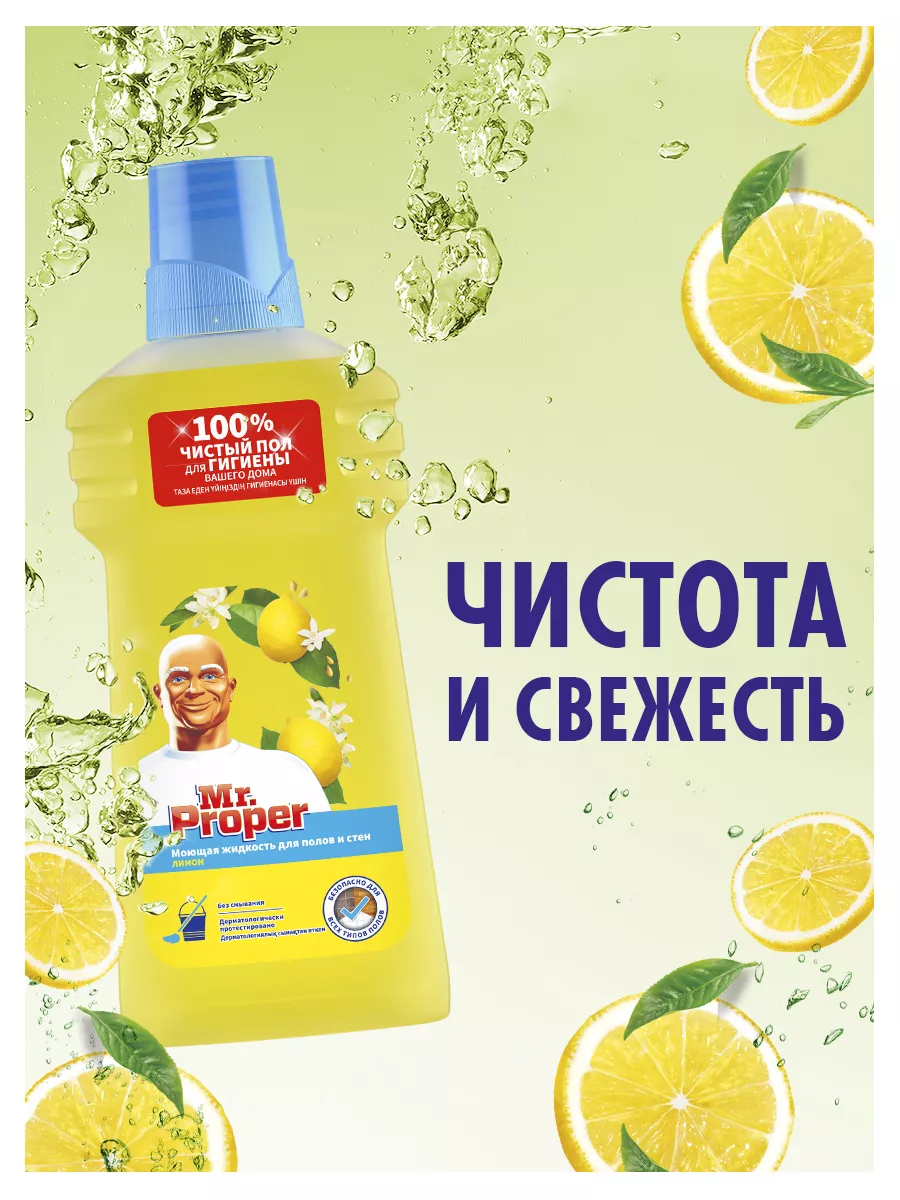 Описание: Сделайте дом еще более чистым и свежим. Моющее средство для стен и полов Mr. Proper "Лимон" упростит ежедневную уборку. Раствор подходит для мытья ламината, паркета, декоративного камня, линолеума, а также деревянных полов. Средством можно очищать кафель, сантехнику, а также любые другие твердые поверхности.Особенности средства для мытья полов:- БЕЗ СМЫВАНИЯ. Средство не требует смывания.- ДВОЙНОЙ ЭФФЕКТ. Mr. Proper обладает антибактериальным и антистатическим эффектом.- ЧИСТЫЙ ПОЛ НА 100%. Средство удаляет пыль, жир, пятна и другие загрязнения, придает блеск и не оставляет разводов.- УНИВЕРСАЛЬНОСТЬ. Подходит для всех типов полов.- ДЕРМАТОЛОГИЧЕСКИ ПРОТЕСТИРОВАНО.Моющая жидкость для полов и стен придаст дому аромат свежести и чистоты. Упаковки объемом 500 мл хватит на несколько циклов уборки. Срок годности средства - 18 месяцев. Размеры упаковки (Д х Ш х В) - 46 х 90 х 232 мм. Вес составляет 562 г.