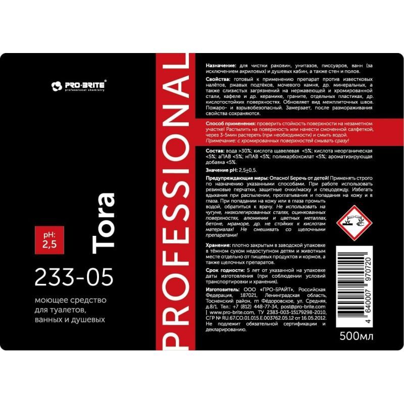 Моющее средство для туалетов, ванных и душевых Pro-Brite TORA, 500 мл.