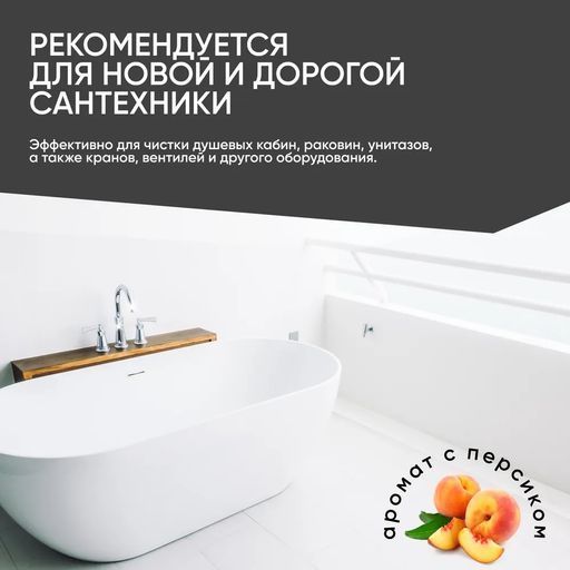жидкий сильнокислотный готовый к применению препарат, прозрачный без цвета с ароматом персика, против известковых налётов, ржавых подтёков, мочевого камня, др. минеральных, а также слизистых загрязнений на нержавеющей и хромированной стали, кафеле и др. керамике, граните, отдельных пластиках, др. кислотостойких поверхностях. Обновляет вид межплиточных швов. Пожаро- и взрывобезопасный. Замерзает, после размораживания свойства сохраняются.