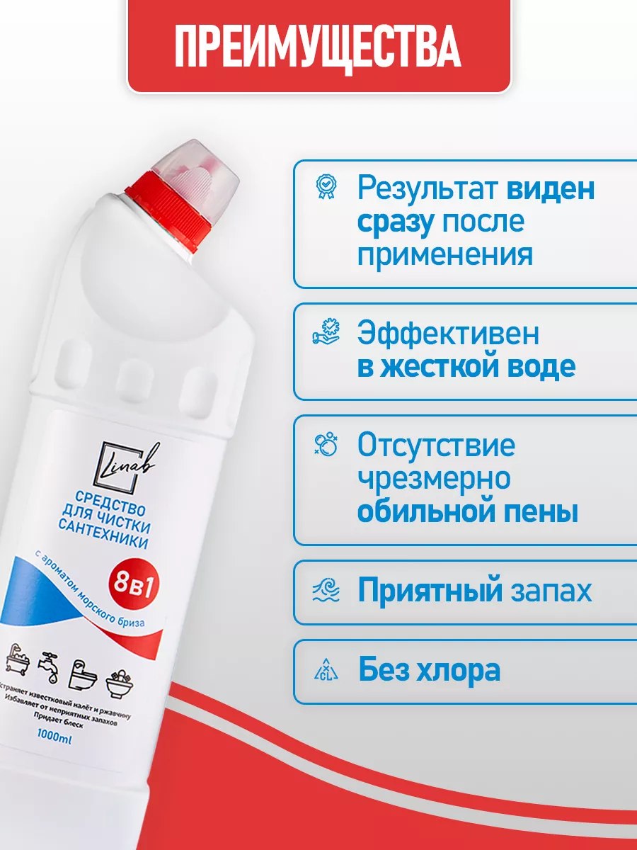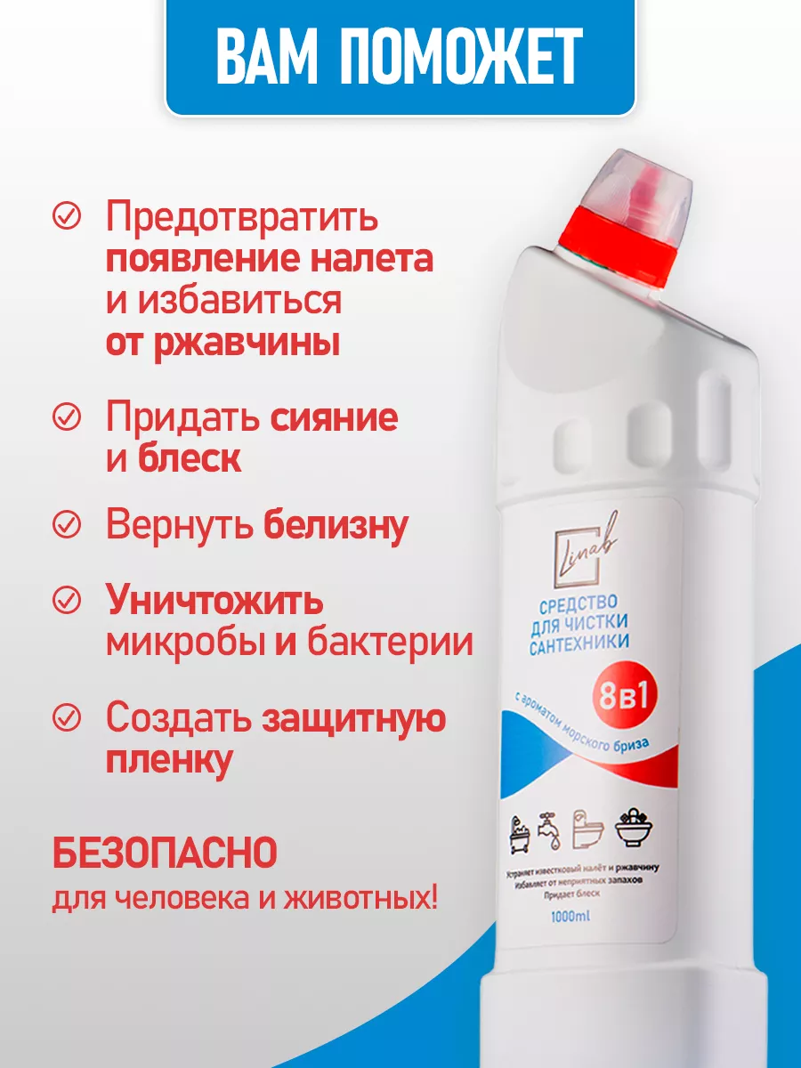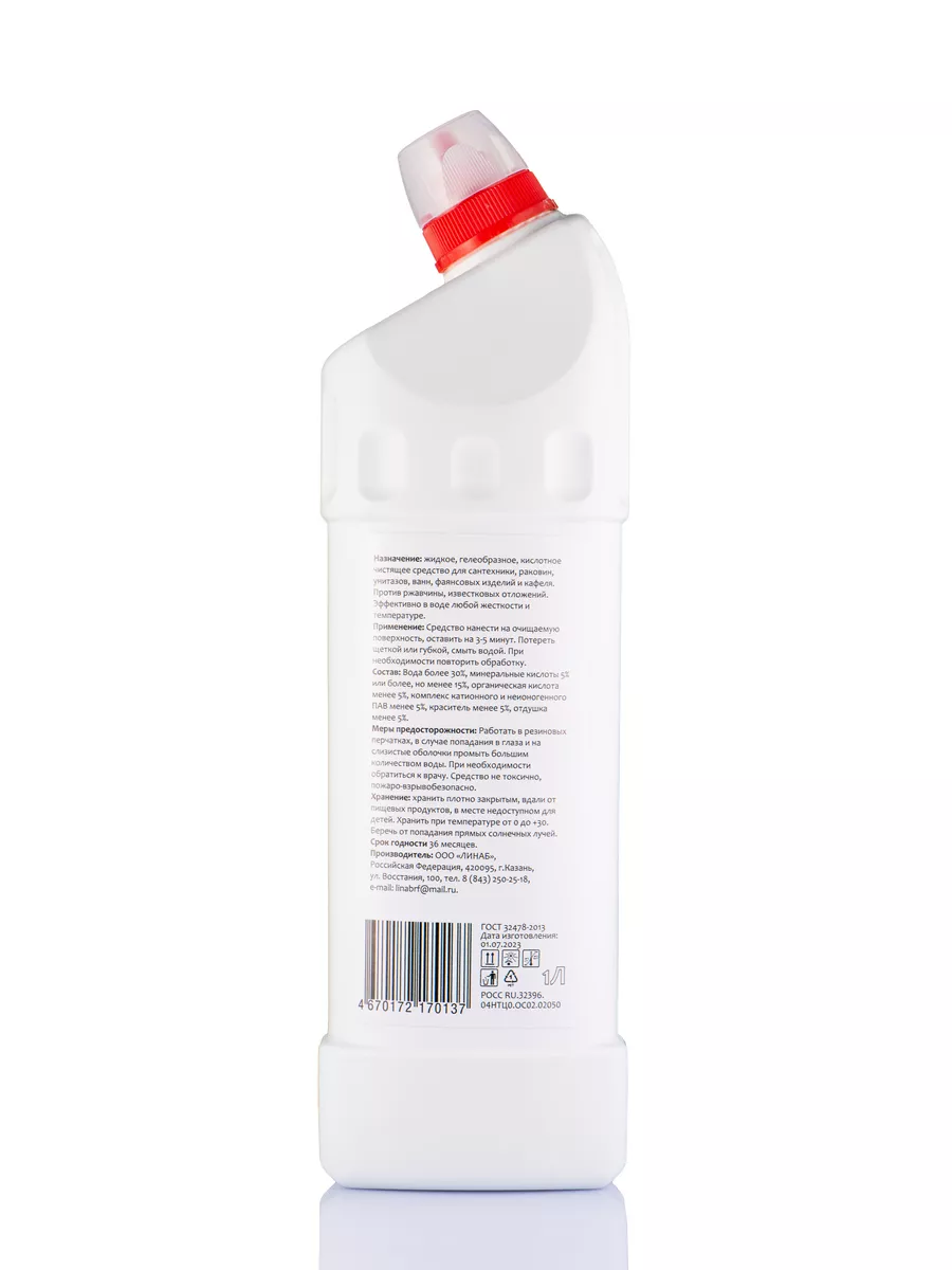 Описание: Средство для сантехники от Линаб - это универсальная и безопасная жидкость БЕЗ ХЛОРА и едкого запаха, которая без труда справляется с грязью. Идеально для регулярного применения и профилактики. Linab - это средство, которое удаляет любые загрязнения, известковый налет и ржавчину, мыльный камень с кранов и раковин, ванн и душевых кабин, унитазов и биде. Он подходит для очистки любых поверхностей устойчивых к кислотам: металлических изделий, покрытий из нержавеющей стали и керамики, фаянса и плитки, акрила и пластика. Linab - это не только эффективный, но и безопасная жидкость для очистки туалета и ванной комнаты. Она не содержит хлора и не вредит окружающей среде. Средство имеет приятный аромат и не раздражает кожу и дыхательные пути. ПОДХОДИТ ДЛЯ СЕМЕЙ С ДЕТЬМИ И ЖИВОТНЫМИ, а также для людей с аллергией. Оно экономично в использовании благодаря нашей уникальной формуле и эффективно как в горячей, так и в холодной воде. Минеральные кислоты обеспечивают высокую эффективность в борьбе с известковым налетом и ржавчиной. Они проникают в самые труднодоступные места и разрушают загрязнения на молекулярном уровне избавляя от бактерий. Органическая кислота усиливает действие минеральных кислот и придает средству мягкость и щадящий эффект. Оно не повреждает покрытия сантехники и не вызывает коррозии. Комплекс катионного и неионогенного ПАВ обладает отличными моющими свойствами. Он эффективно удаляет жирные и мыльные загрязнения, а также образует защитную пленку на поверхности сантехники. Меры безопасности при использовании моющего средства Linab: Не допускайте попадания моющего средства в глаза или на слизистые оболочки. В случае контакта промойте обильным количеством воды. Не применяйте на поверхностях из мрамора или других материалов, чувствительных к кислотам. Не смешивайте с другими чистящими средствами. Храните в недоступном для детей месте. Создано в России, с любовью и заботой о человеке и окружающей его среде.