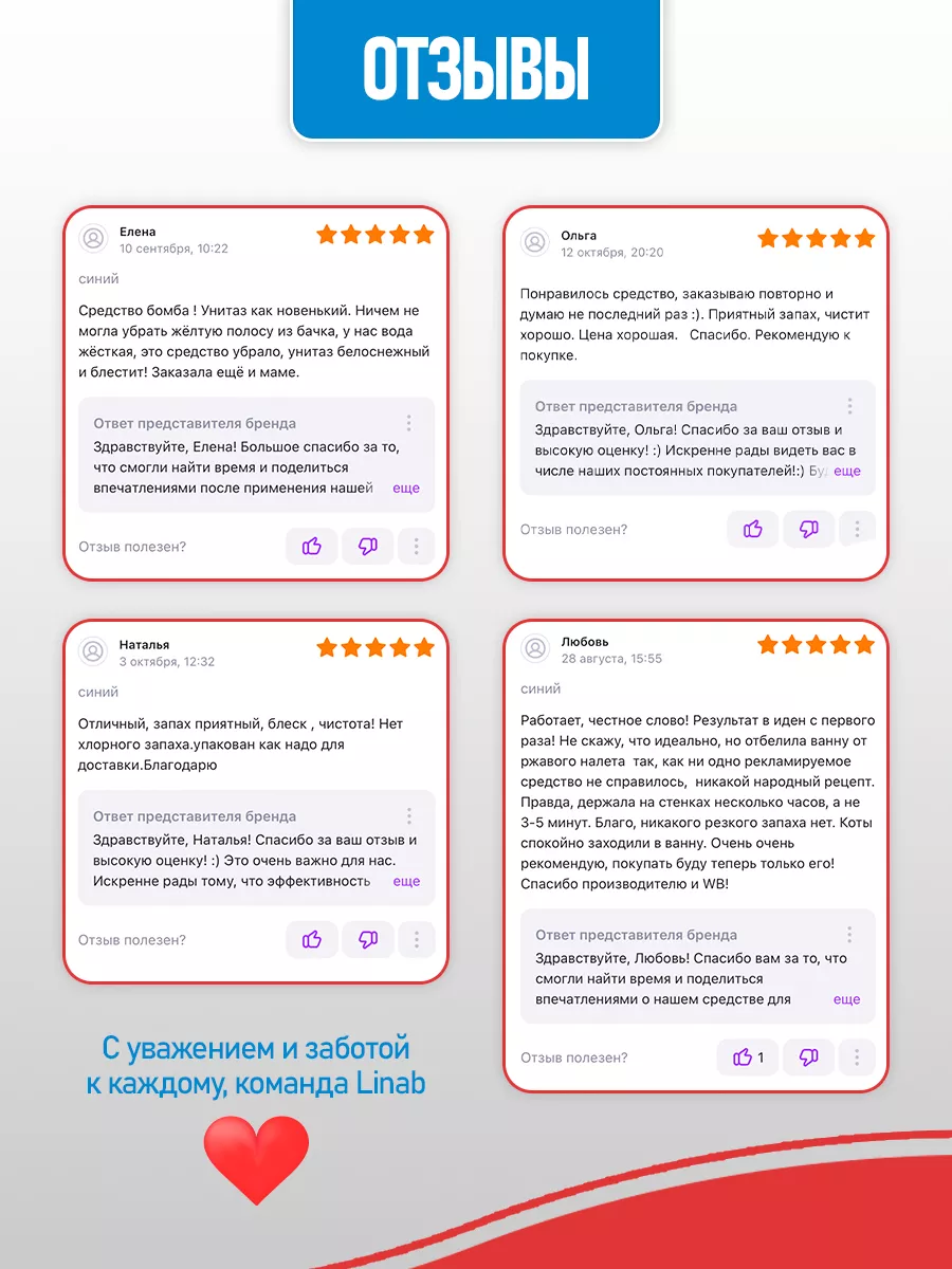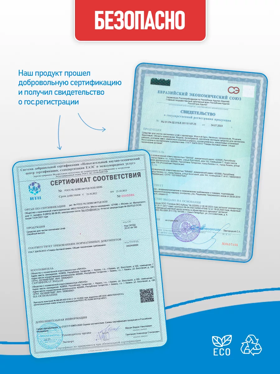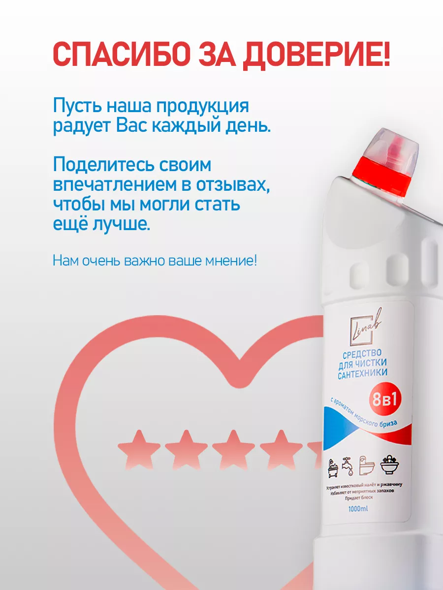 Описание: Средство для сантехники от Линаб - это универсальная и безопасная жидкость БЕЗ ХЛОРА и едкого запаха, которая без труда справляется с грязью. Идеально для регулярного применения и профилактики. Linab - это средство, которое удаляет любые загрязнения, известковый налет и ржавчину, мыльный камень с кранов и раковин, ванн и душевых кабин, унитазов и биде. Он подходит для очистки любых поверхностей устойчивых к кислотам: металлических изделий, покрытий из нержавеющей стали и керамики, фаянса и плитки, акрила и пластика. Linab - это не только эффективный, но и безопасная жидкость для очистки туалета и ванной комнаты. Она не содержит хлора и не вредит окружающей среде. Средство имеет приятный аромат и не раздражает кожу и дыхательные пути. ПОДХОДИТ ДЛЯ СЕМЕЙ С ДЕТЬМИ И ЖИВОТНЫМИ, а также для людей с аллергией. Оно экономично в использовании благодаря нашей уникальной формуле и эффективно как в горячей, так и в холодной воде. Минеральные кислоты обеспечивают высокую эффективность в борьбе с известковым налетом и ржавчиной. Они проникают в самые труднодоступные места и разрушают загрязнения на молекулярном уровне избавляя от бактерий. Органическая кислота усиливает действие минеральных кислот и придает средству мягкость и щадящий эффект. Оно не повреждает покрытия сантехники и не вызывает коррозии. Комплекс катионного и неионогенного ПАВ обладает отличными моющими свойствами. Он эффективно удаляет жирные и мыльные загрязнения, а также образует защитную пленку на поверхности сантехники. Меры безопасности при использовании моющего средства Linab: Не допускайте попадания моющего средства в глаза или на слизистые оболочки. В случае контакта промойте обильным количеством воды. Не применяйте на поверхностях из мрамора или других материалов, чувствительных к кислотам. Не смешивайте с другими чистящими средствами. Храните в недоступном для детей месте. Создано в России, с любовью и заботой о человеке и окружающей его среде.