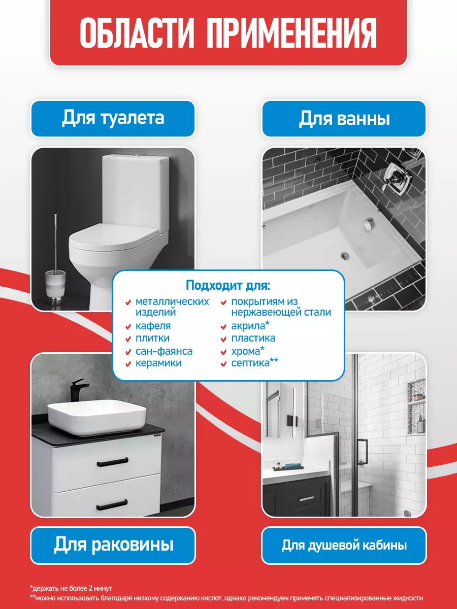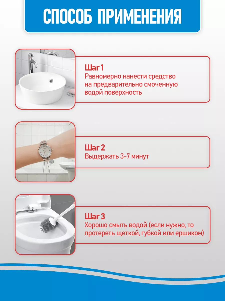 Эффект чистящего средства удаление ржавчины и известкового налёта; дезинфекция; блеск и сияние
