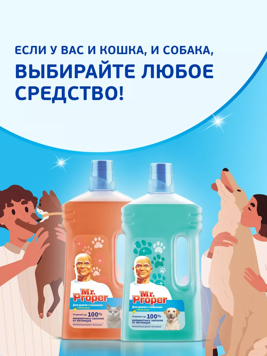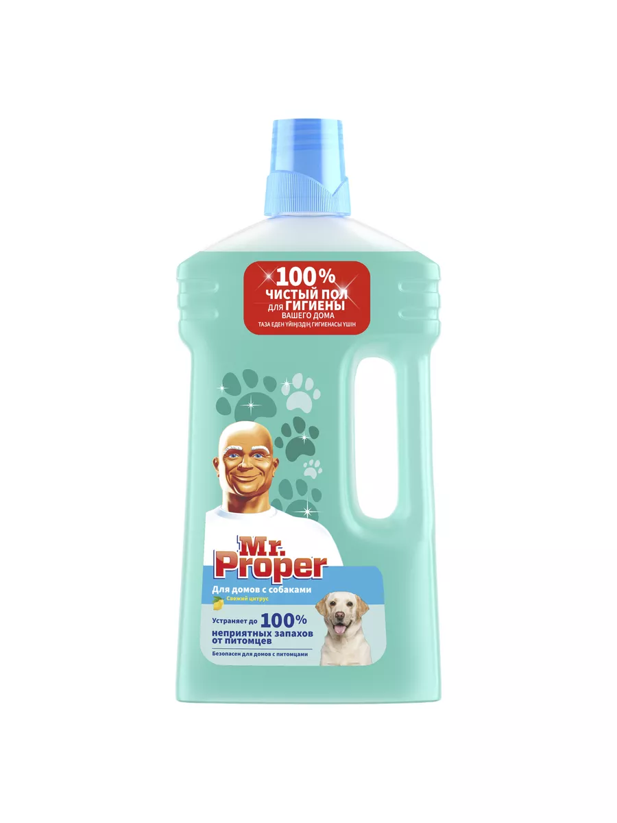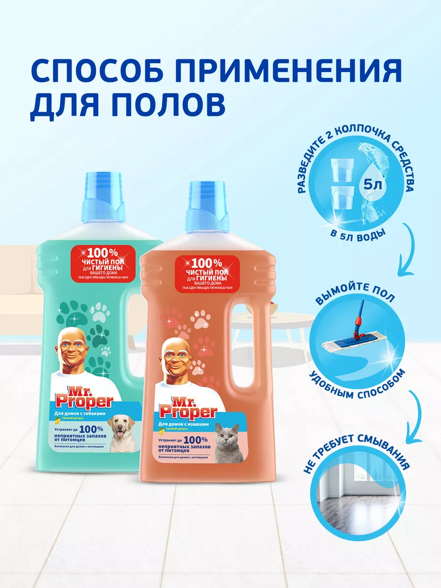 Описание: Моющая жидкость для полов и стен Mr. Proper для домов с собаками удаляет до 100% грязи и запаха от питомцев! Формула жидкости основана на технологии захвата и устранения даже самых стойких ароматов. Мощная чистящая формула удаляет до 100% грязи от домашних животных, например, засохшую еду вокруг миски, грязь около подстилки любимого питомца или брызги вокруг лотка. Оставляет сияющие поверхности и наполняет Ваш дом приятным цитрусовым ароматом. Подходит для использования на большинстве поверхностях в доме. Не использовать на промасленной и необработанной древесине. Не использовать на домашних животных. Не содержит хлора. Способ применения: добавить два колпачка в ведро с теплой водой.