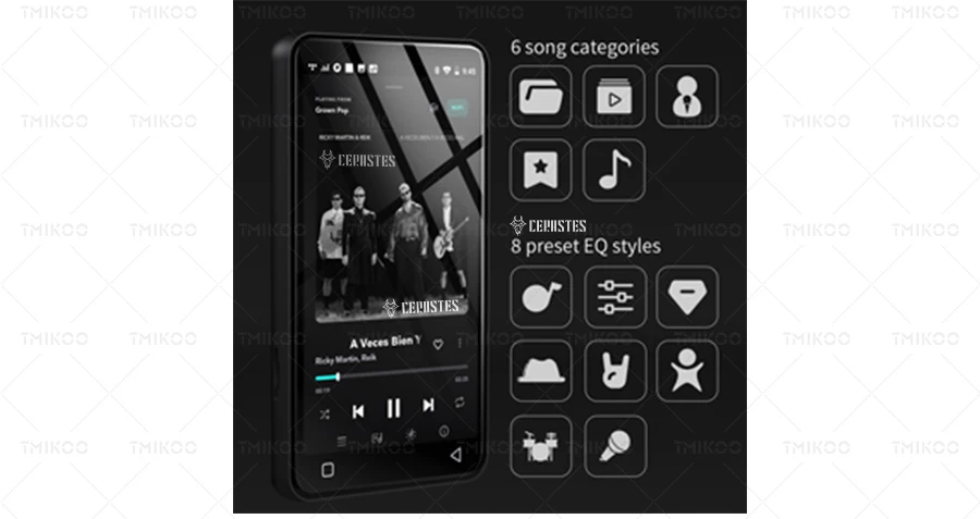 • 8 предустановленных стилей эквалайзера: поп, блюз, классика, джаз, рок, танец, металл, голос и 10 настраиваемых стилей эквалайзера.